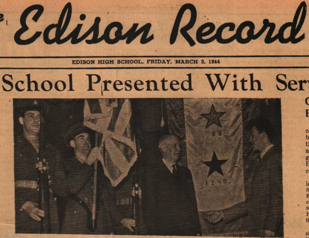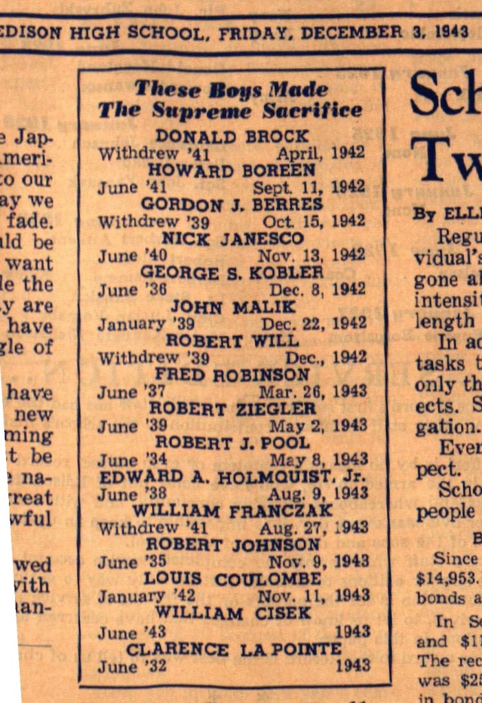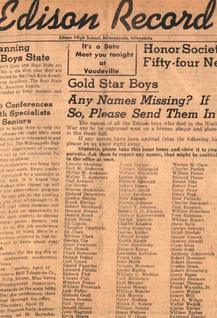 One of the goals of this site is to highlight the Edison connection of the 116 names on the plaque. When I started this project, the assumption was that they were all graduates from the school. That proved to be incorrect. The list appears to include anyone that attended Edison at any point and subsequently died in service. For those that graduated, the connection is easy to make. There is usually a Senior picture in the yearbook, and a mention in the newspaper when a death notice, or obituary was published. For those that withdrew, it has been more difficult. The Edison Record student newspaper reported the deaths of some of the students that had withdrawn. The death notice or obituary often mentions that the person attended Edison as well. For some of the 116 people, the only connection to Edison found to date is their inclusion in the “In Memoriam” section of the 1946 Wizard yearbook (105 names) or their inclusion on the plaque itself.