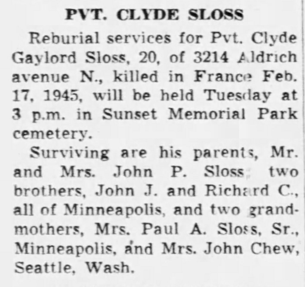 In 1948, Clyde’s remains were returned to the United States for reburial at Sunset Memorial Park Cemetery.