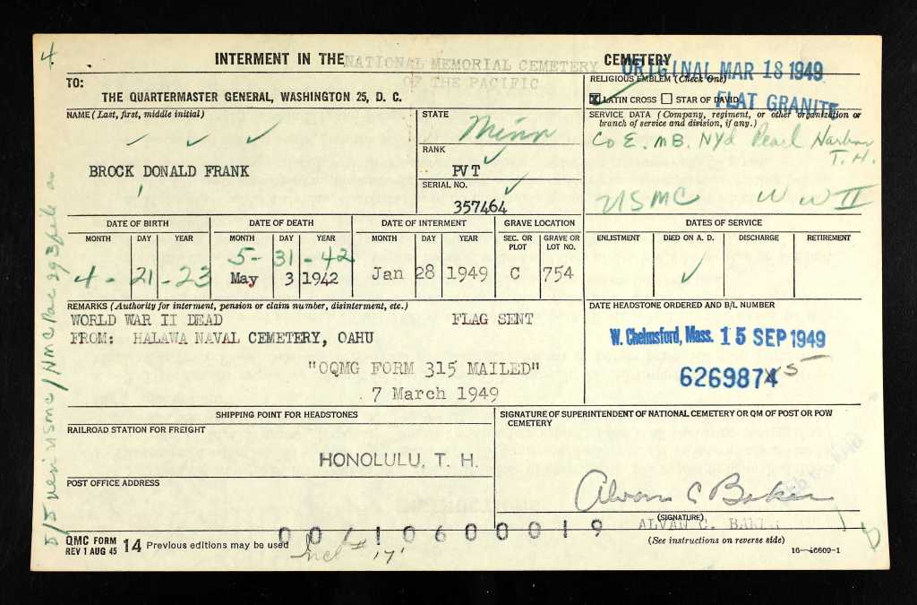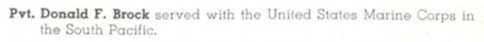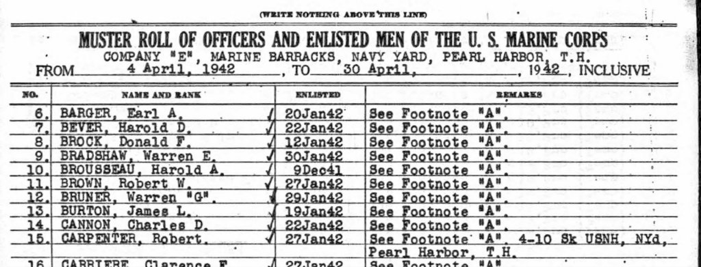 Donald enlisted in the Marine Corps on 12Jan1942. By April 1942 he was stationed at Marine Barracks Navy Yard in Pearl Harbor, HI.