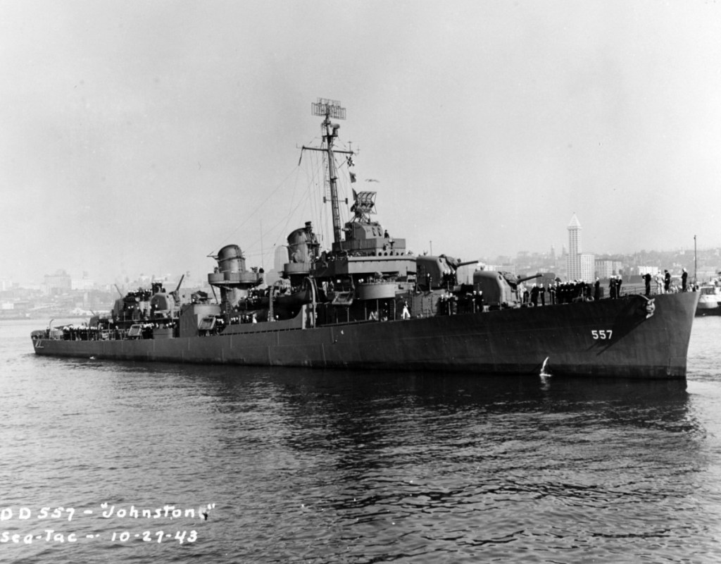 On 25Oct1944, Johnston, supporting the Allied invasion of the Philippines, participated in the Battle Off Samar. The largest naval battle in history, Johnston’s actions that day, are considered one of great “last stands” in US Navy history.