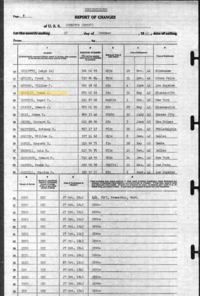 Duane enlisted in the Navy on 31May1943. After basic training, he joined the inaugural crew of the destroyer USS Johnston when it was commissioned on 27Oct1943.