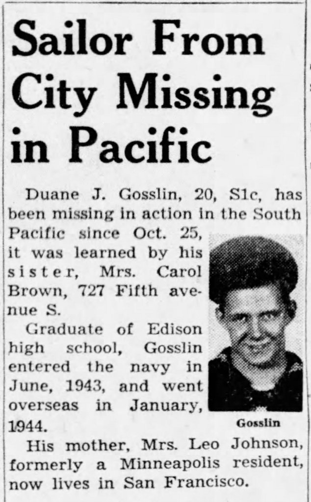 It is unknown if Duane was one of the 50 men killed in action, or if he was able to abandon ship and went missing after. His family was informed that he was missing in February 1945.