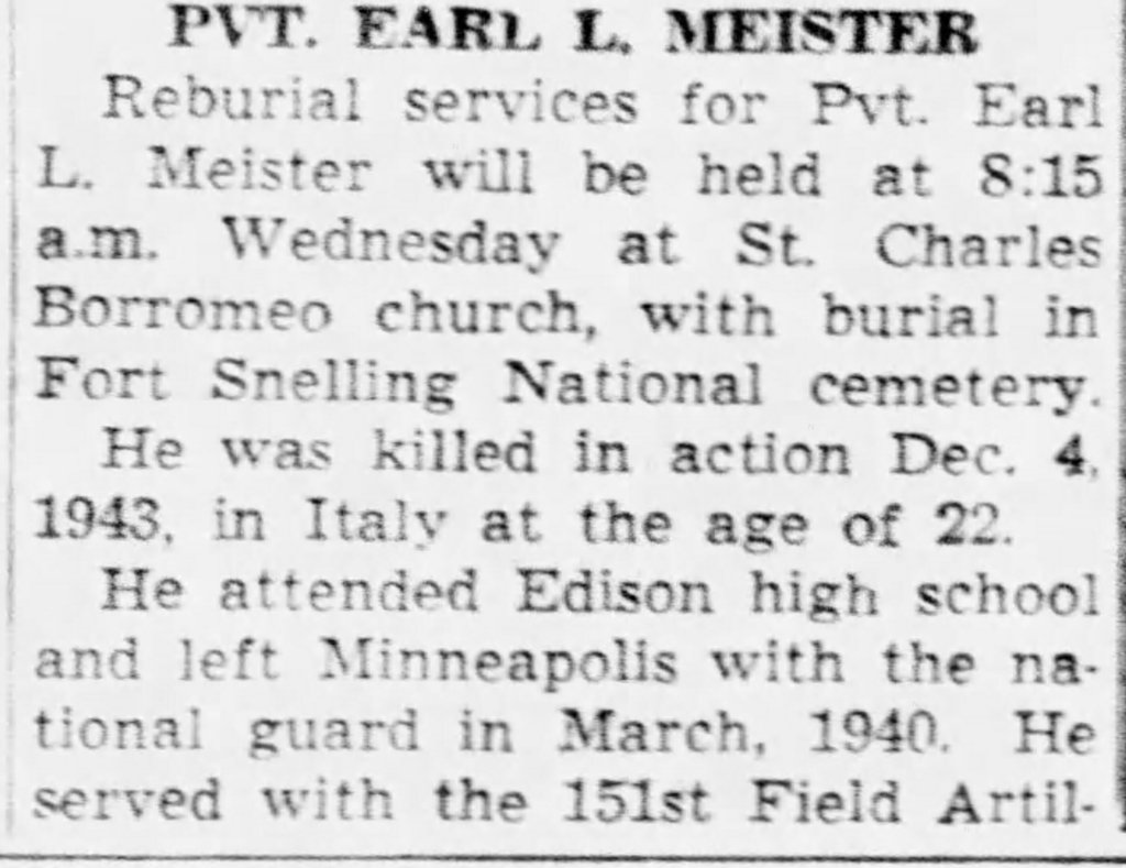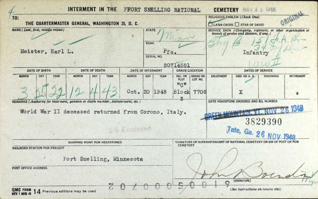 Earl was originally buried in a temporary military cemetery in Corono, Italy. In 1948 his remains were returned to the United Stated for reburial.