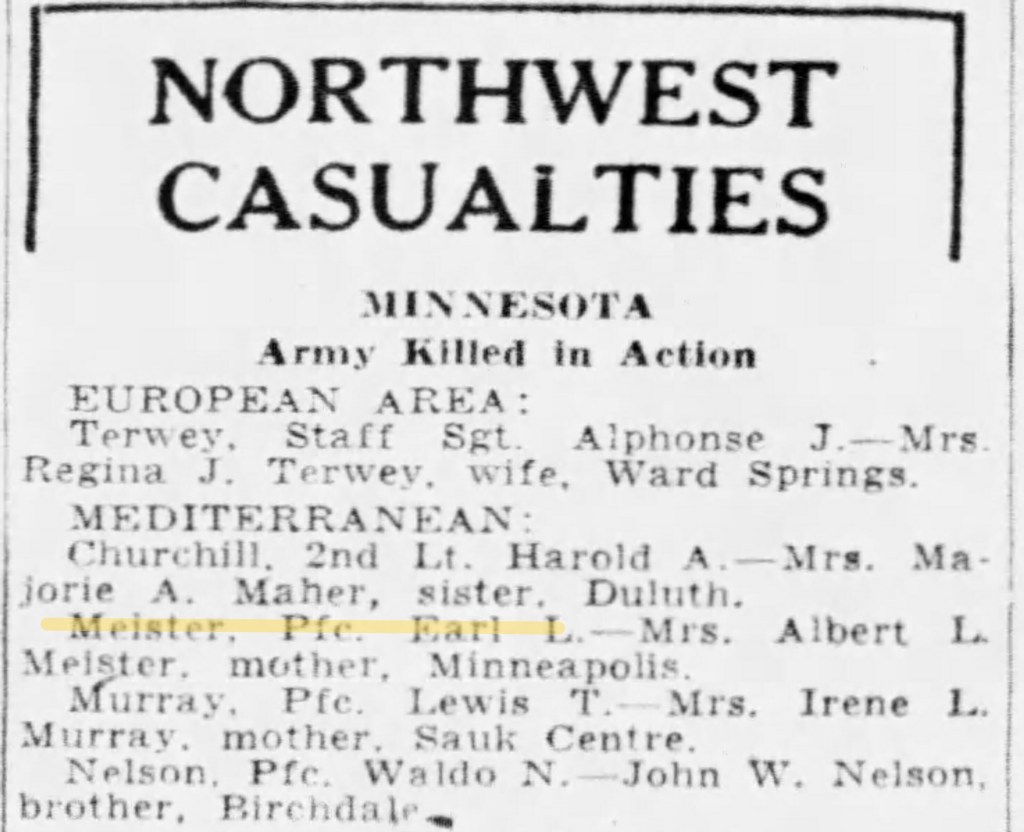 By December 1943 the 151st was supporting the 34th Infantry Division as they attached the German Bernhart Line in the vicinity of Monte Panano to the North of Naples. During this fighting, on 4December1943, that Earl was killed. The circumstances of his death are unknown.