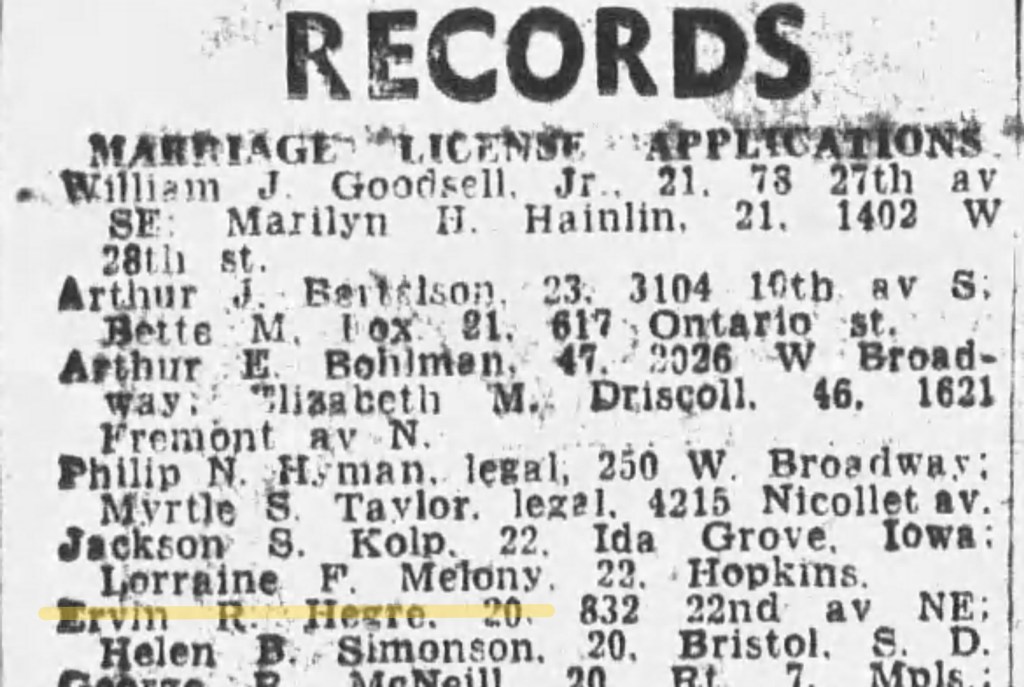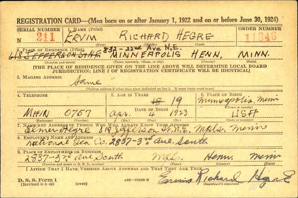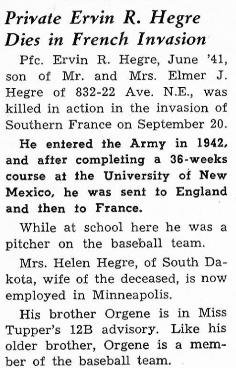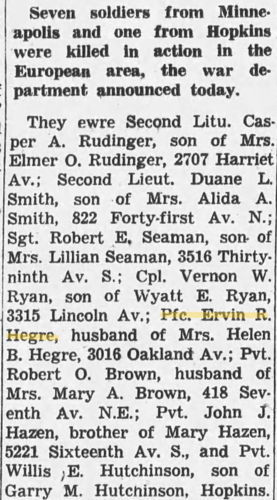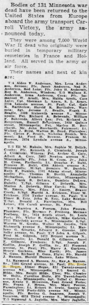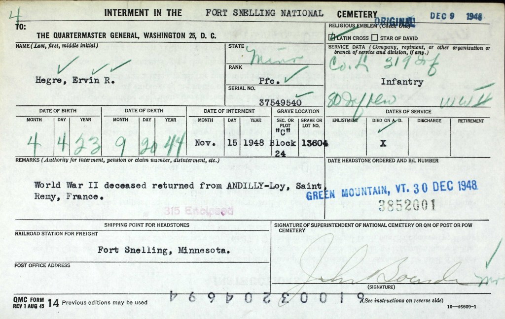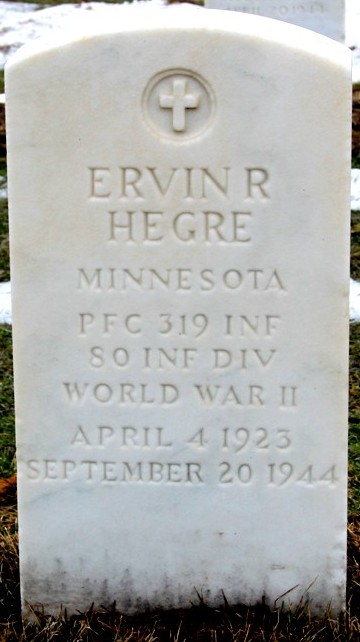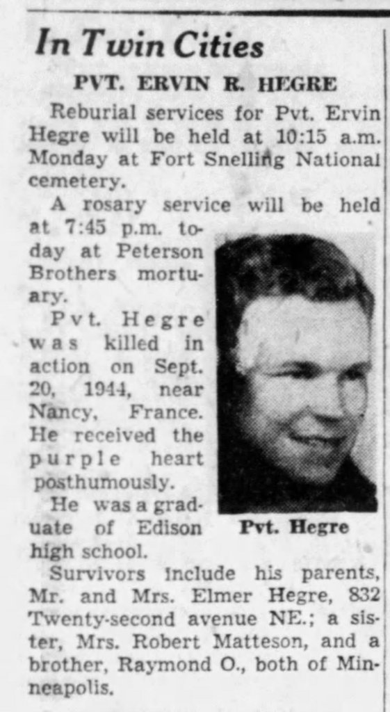 Ervin was buried in a temporary military cemetery in France. In October 1948 his remains were returned to Minnesota for reburial.