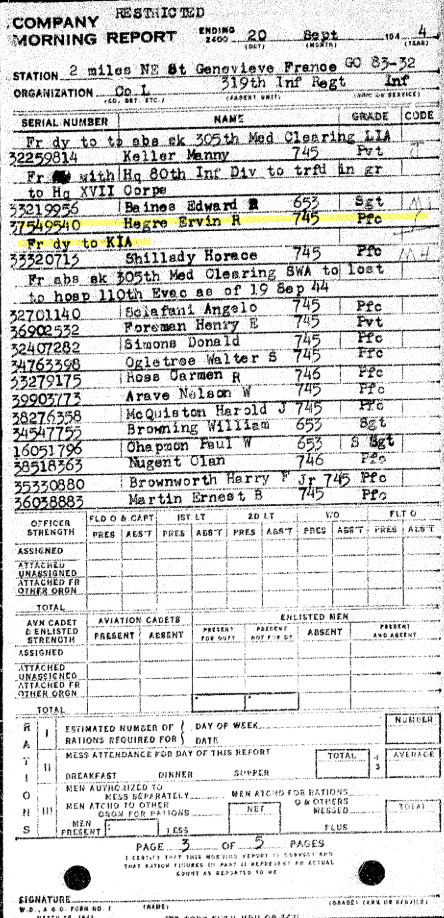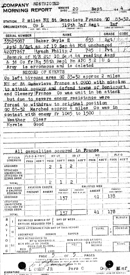 On 20Sep1944 Ervin and Company L found themselves camped 2 miles NE of Ste. Genevieve, France. with the mission to attack and occupy the towns of Benicourt and Clemery approximately 2 miles East. Company L was the lead unit of the 3rd Battalion and both battalions were in contact with the enemy from 1045 to 1500 but due to heavy enemy resistance and enemy artillery fire was forced to withdraw to their original positions.