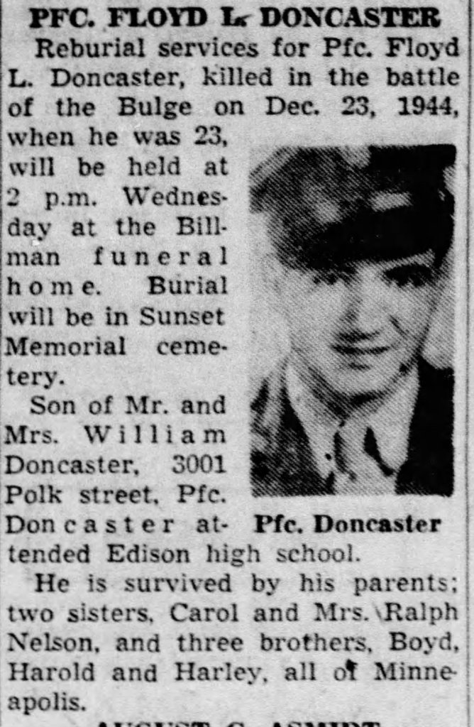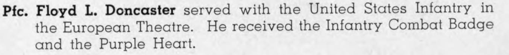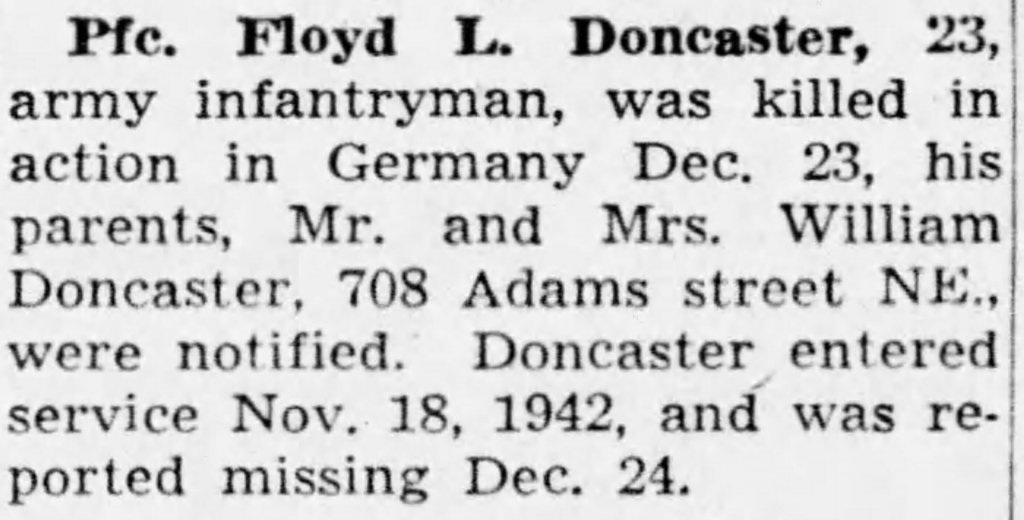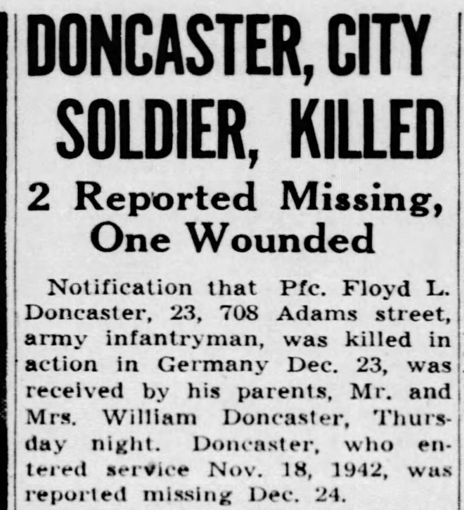 They maintained this position when the Battle of the Bulge started to prevent a German breakthrough. On 23Dec1944 while near the town of Linnach, Germany that Floyd was killed in action. The circumstances of his death or unknown.