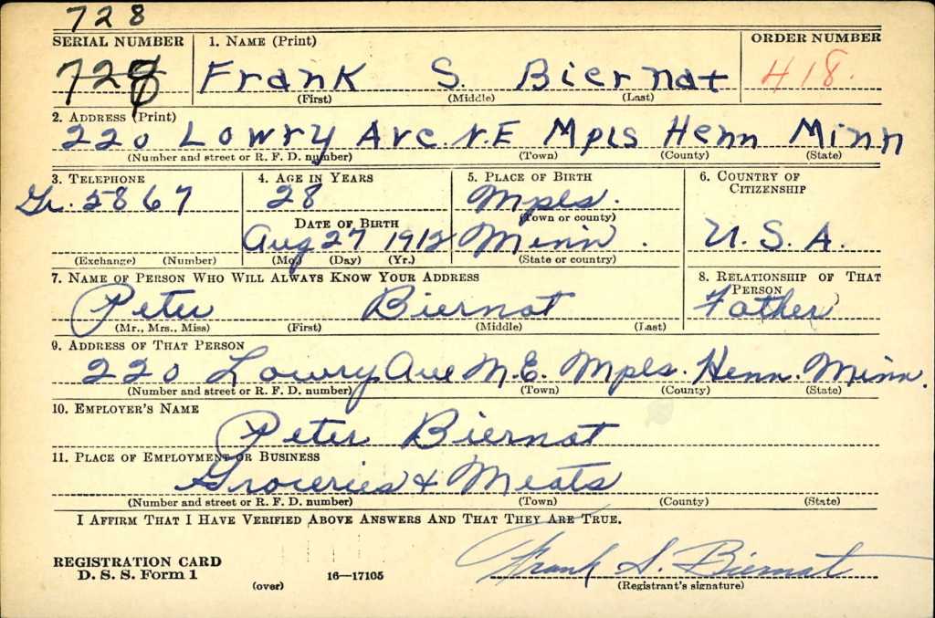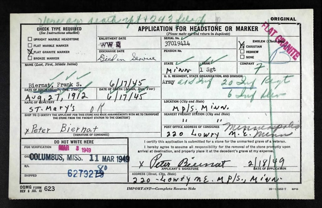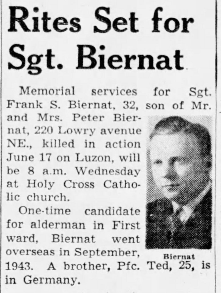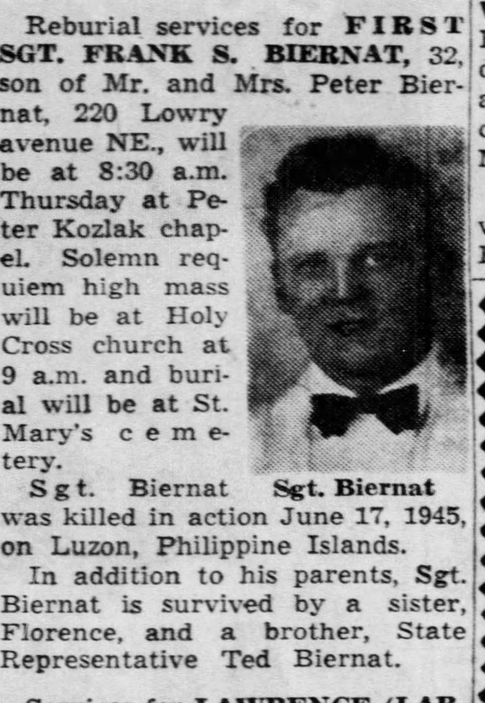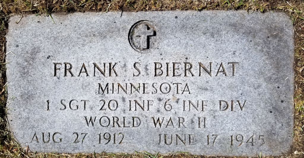 Frank was buried in a temporary cemetery on Luzon. In 1949 his remains were returned to Minnesota for reburial at St. Mary’s Cemetery in Minneapolis.