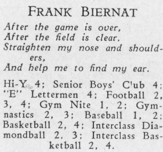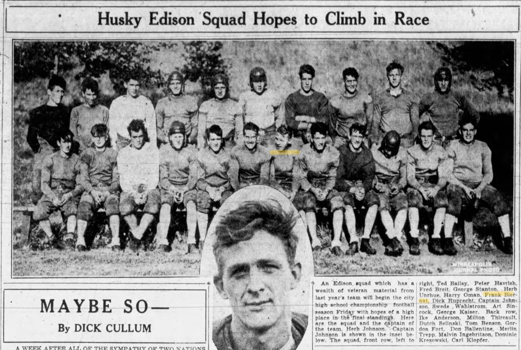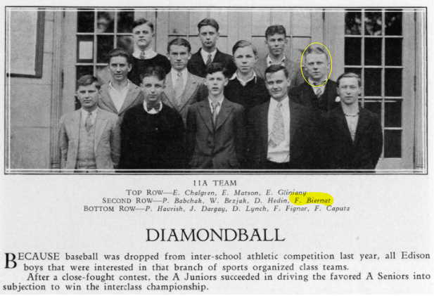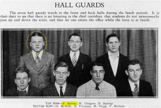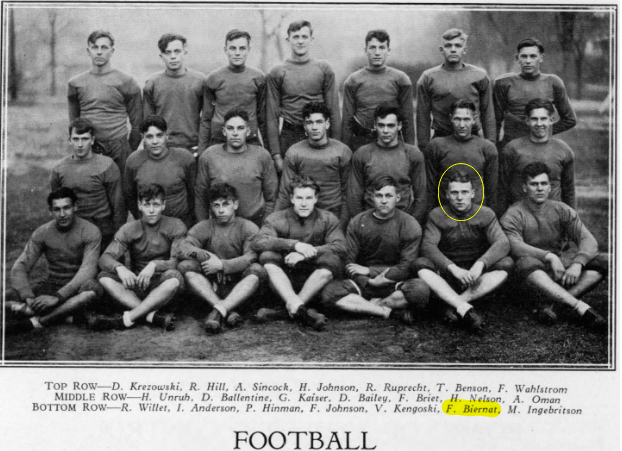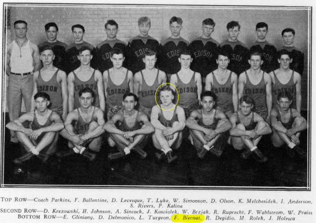 Frank graduated with Class of June 1931. He was an excellent athlete who played football, basketball, baseball, and he participated in gymnastics. He was a 2-time letter winner in football.