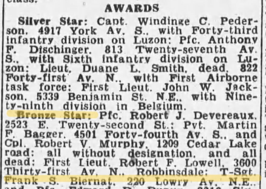 At some point during this period, Frank would earn the Bronze Star Medal.