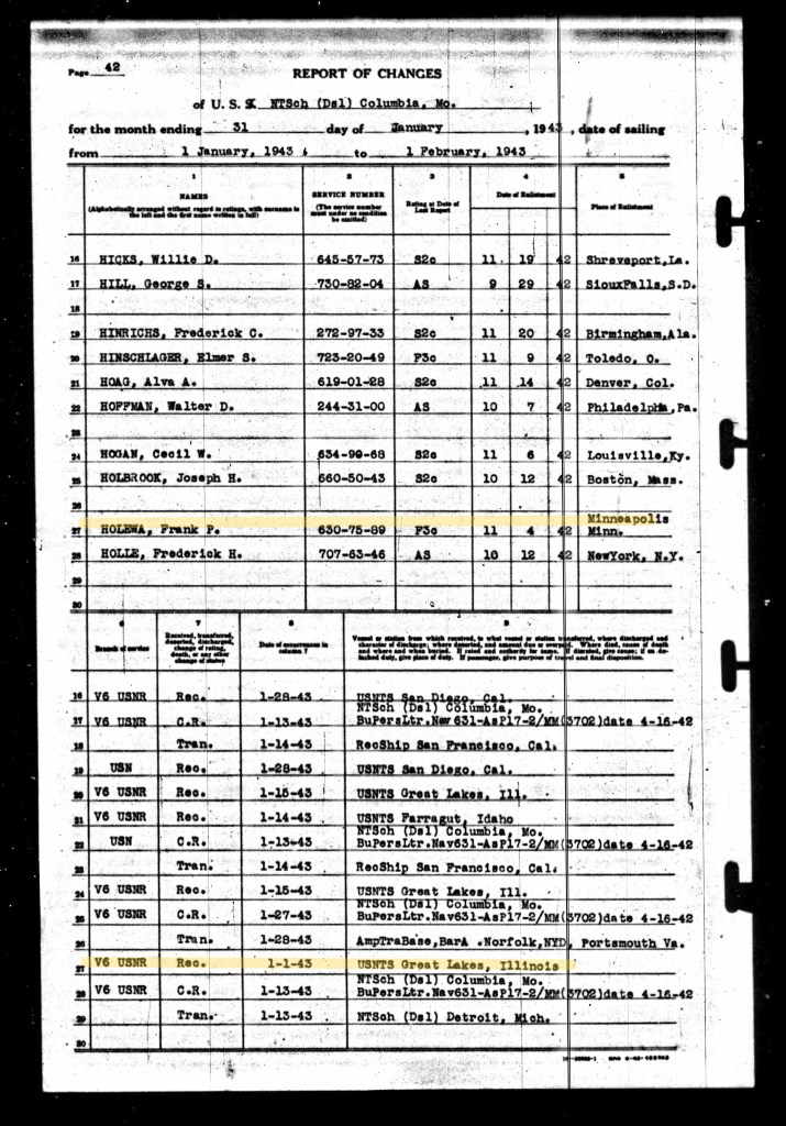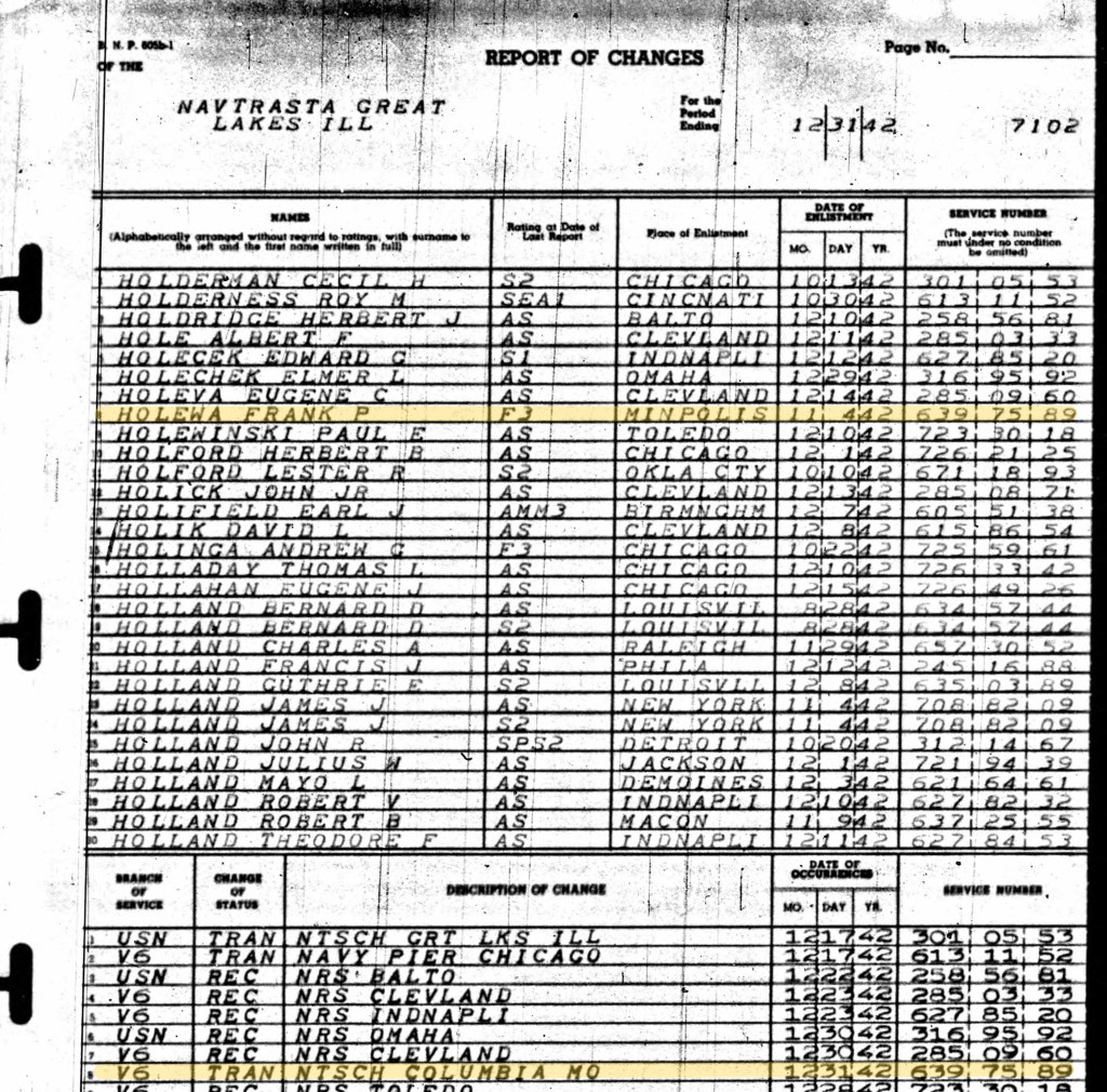 Records indicate that Frank joined the Navy on 4Nov1942. He attended basic training at Great Lakes Naval Training Station in North Chicago, Illinois.