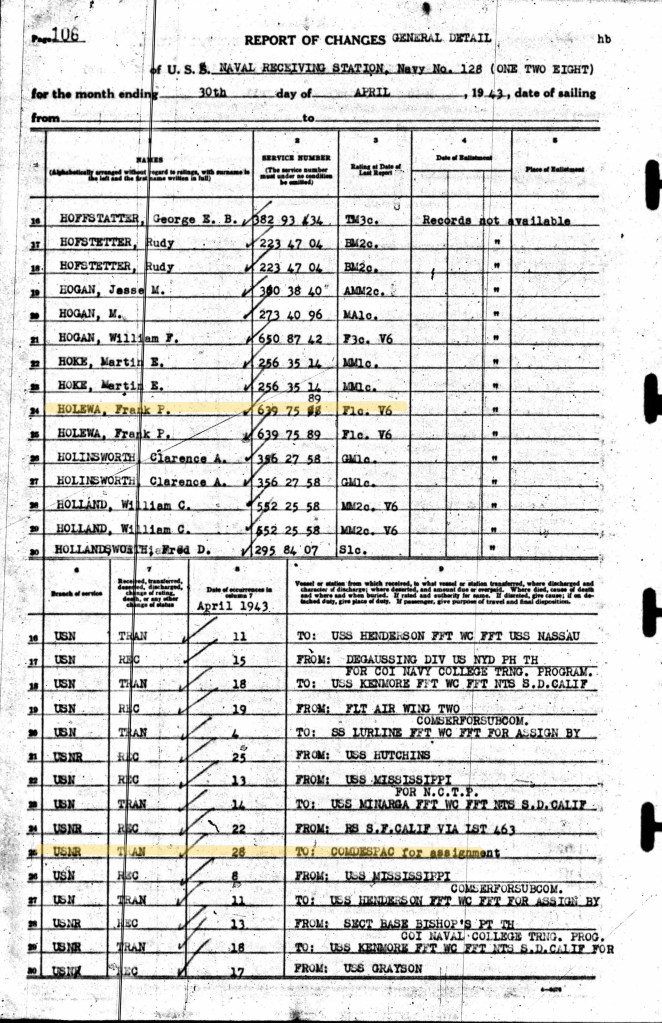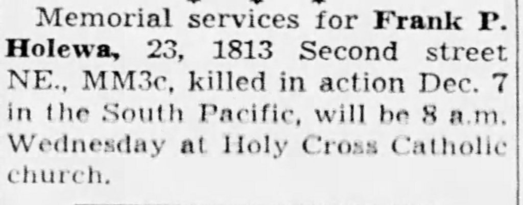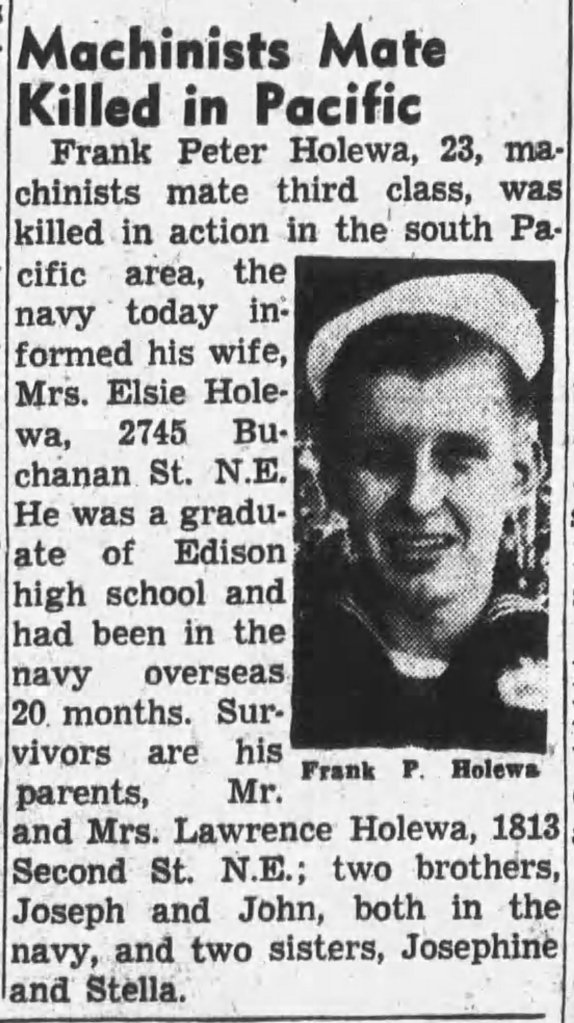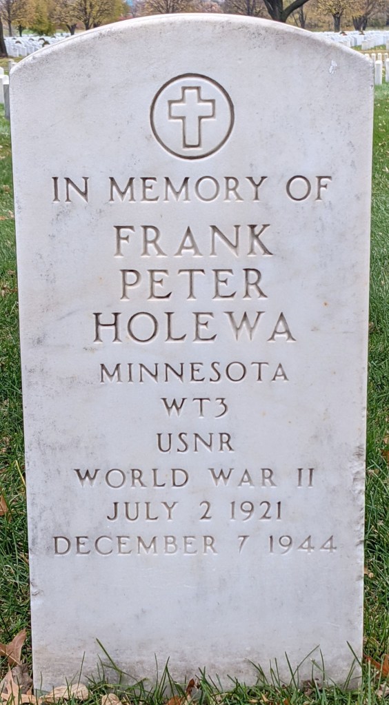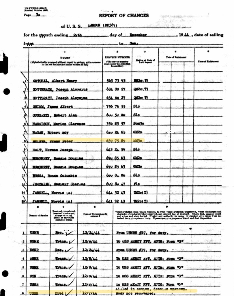 The Lamson’s muster roll for December 1944 listed Frank as killed in action and that his remains were not recoverable.