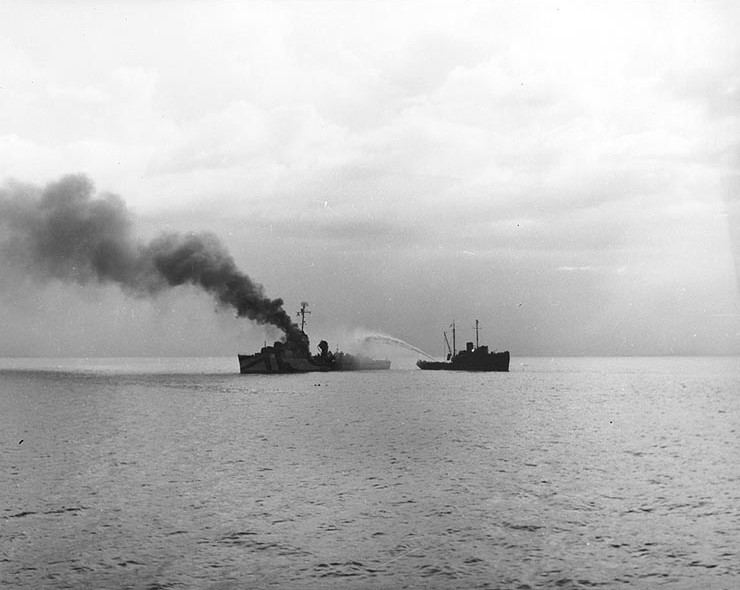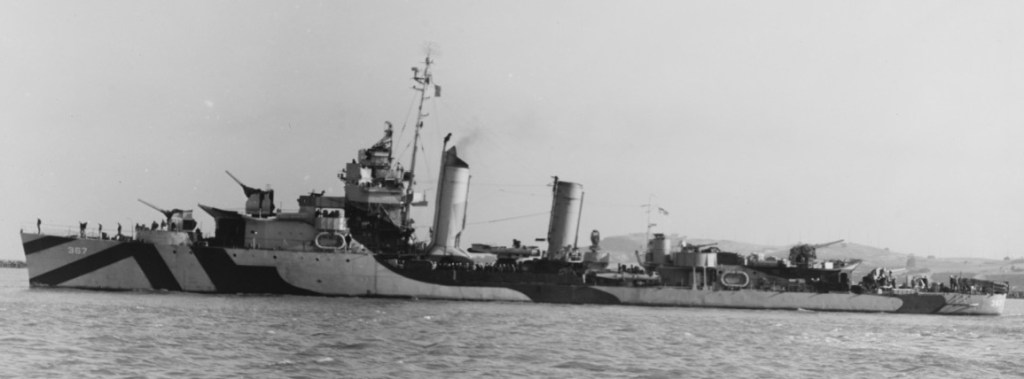 In mid-December 1943, she participated in the invasion of New Britain including shore bombardment at Arawe, New Britain. On December 26, during the landings at Cape Gloucester, she provided fire support and downed two Japanese “Val” dive bombers amid air attacks.