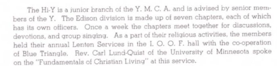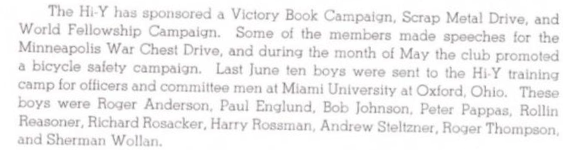 Hi-Y was a service organization affiliated with the Y.M.C.A. These descriptions of Hi-Y are from the pages of the 1943 Wizard yearbook.