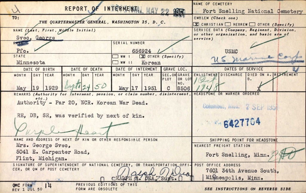 George is buried at Ft. Snelling National Cemetery in Minneapolis, Minnesota.