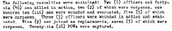 23Sep1950 – The following casualties were sustained: Fifteen (15) men killed in action, forty three (43) wounded in action and evacuated, and (6) men sick evacuated. One (1) POW captured.