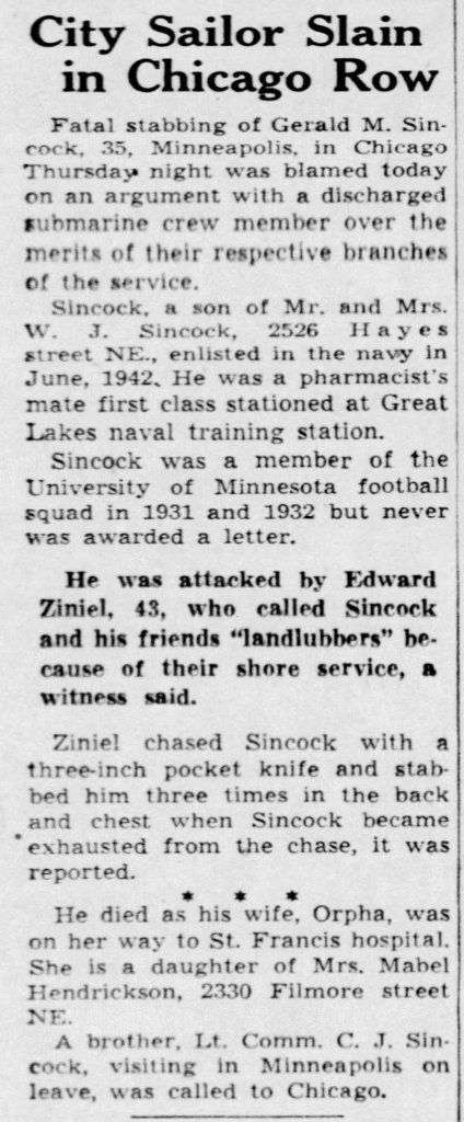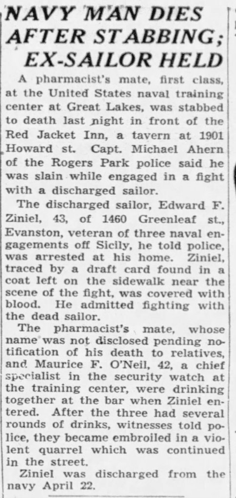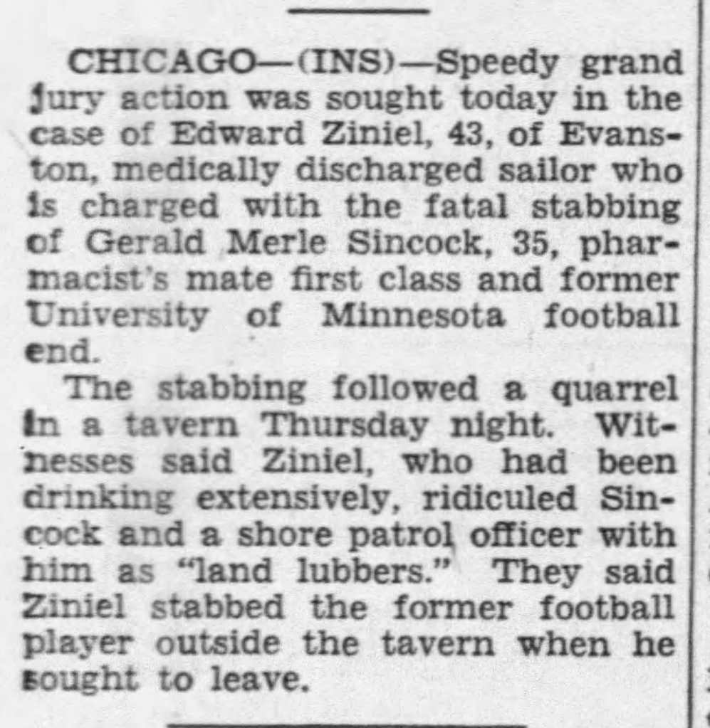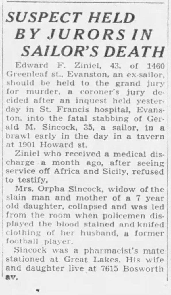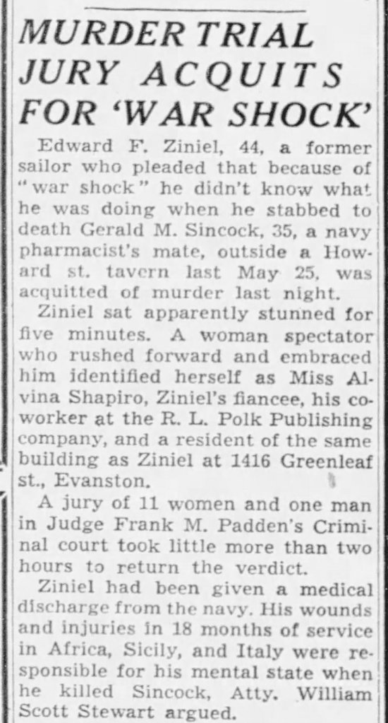 Edward Ziniel went on trial for Gerald’s murder in November 1944. He had received a medical discharge from the Navy prior to the murder for injuries suffered while on active duty. He and his lawyer used a “war shock” defense to claim that Edward did not know what he was doing when he stabbed Gerald. Today, Edward’s claim would be termed Post Traumatic Stress Disorder (PTSD). A jury agreed with Edward and his lawyer, and he was acquitted after only 2 hours of deliberation.