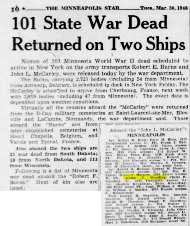 In April 1948 Irving’s remains were returned to Minnesota for reburial.