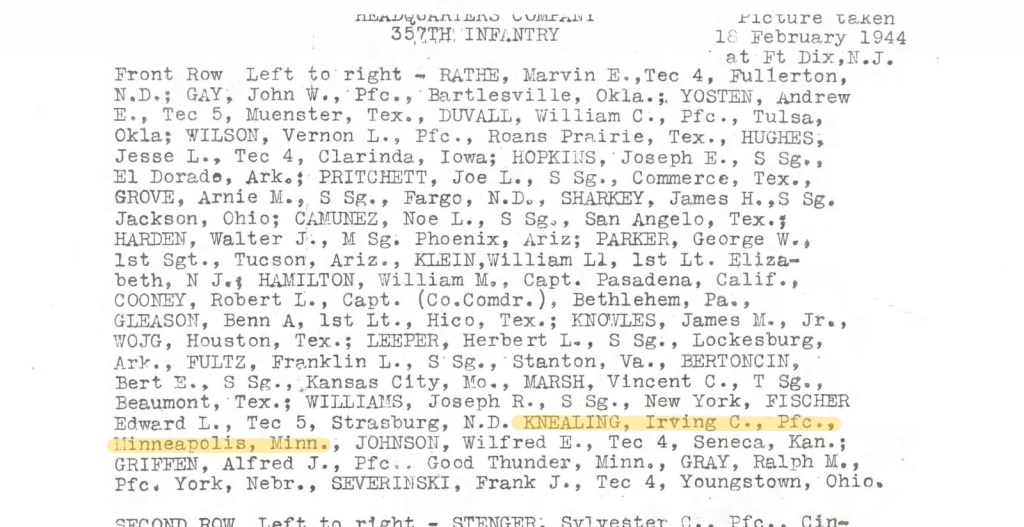Irving joined the Army 17Mar1942. It is unknown as to when he joined the 357th Infantry Regiment. He was with the 357th when by the time they began the long journey to Europe.