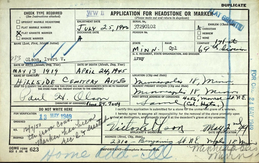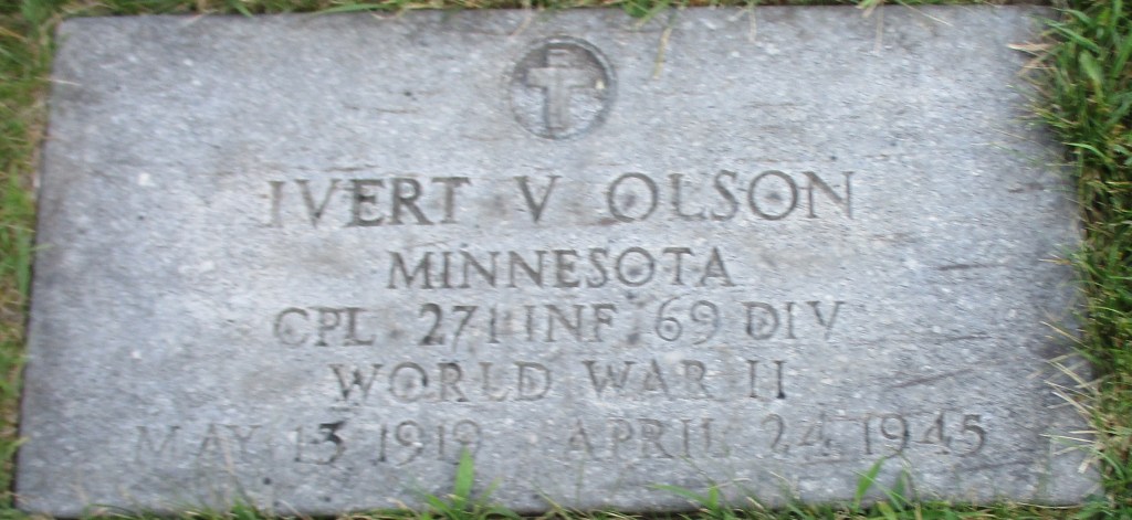 Ivert was buried in a temporary military cemetery in Germany. In 1949 his remains were returned to the US for reburial.