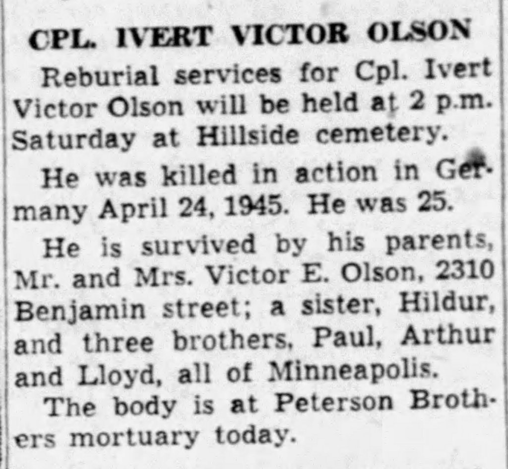 The following day, 24Apr1945, Ivert was killed in action. The circumstances of his death are unknown. It was the last day of combat operations for his unit during the war.