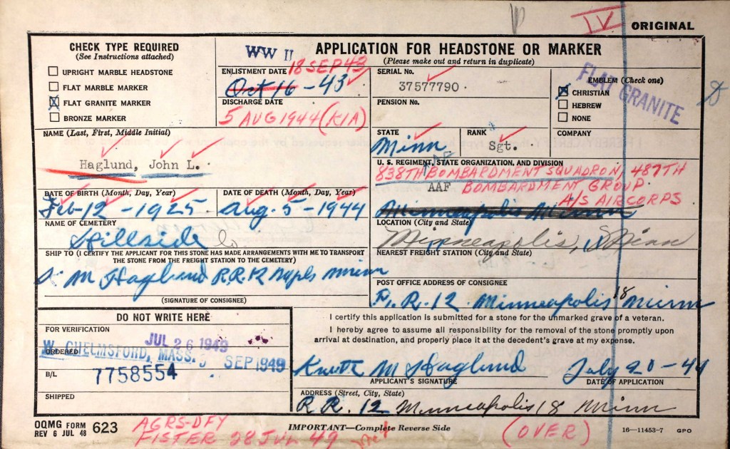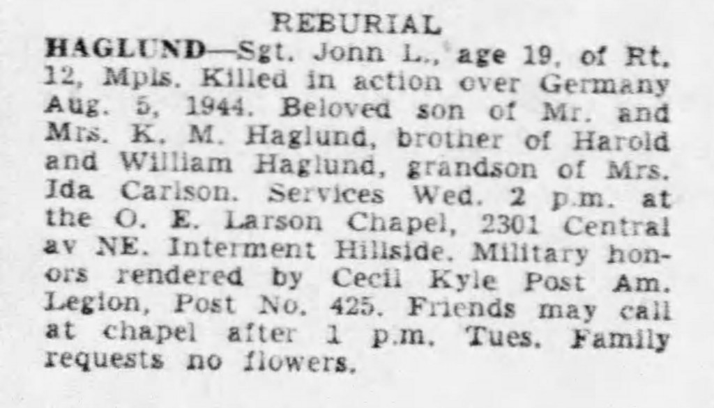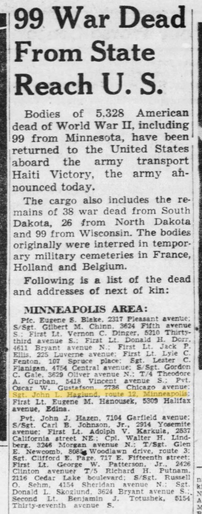 In 1949 John’s remains were returned to Minnesota for reburial.