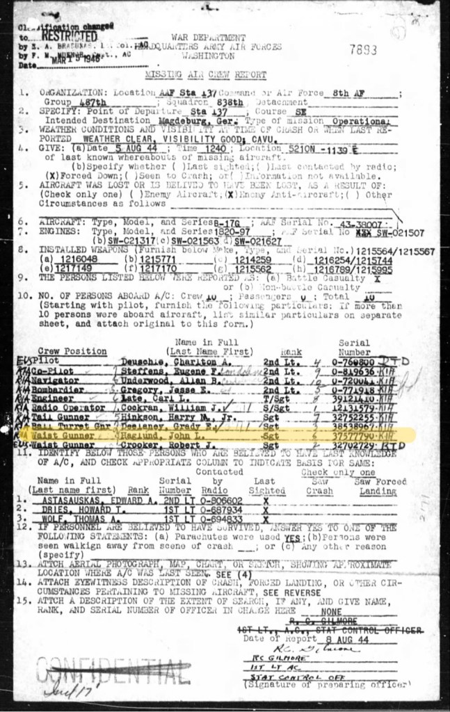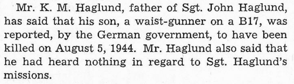 John’s condition was not initially known by his unit, only that his plane had been shot down. He was originally reported as missing.