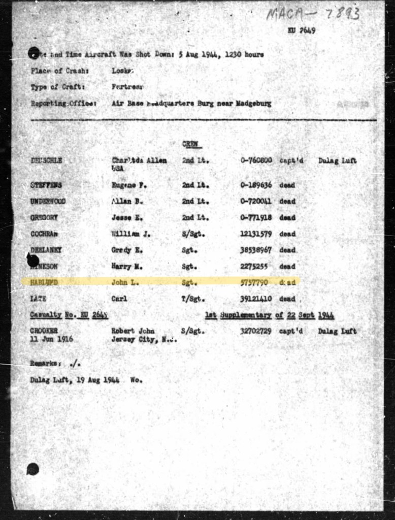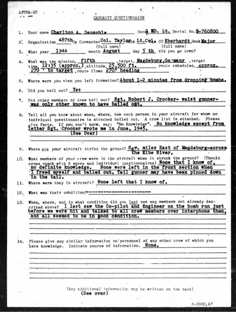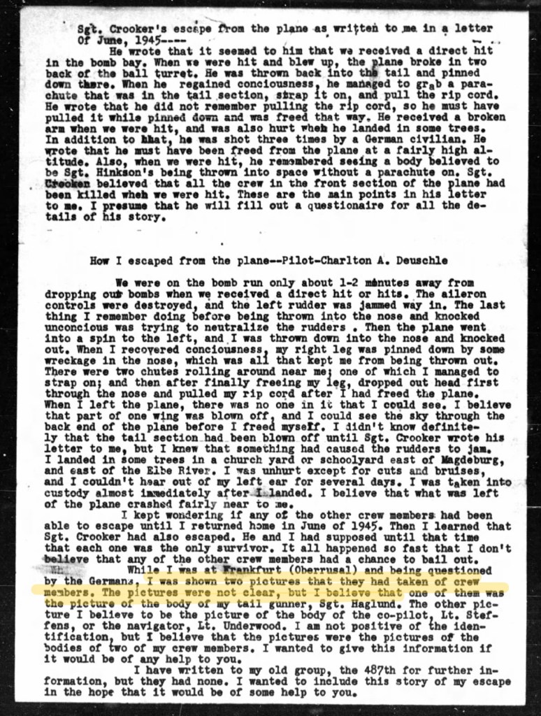 Only 2 of 10 crew members were able to escape the doomed aircraft. The pilot, 2nd Lieutenant Charles Dauchle, and a waist gunner, Sergeant Robert Crooker. Both men were captured, became prisoners, and survived the war.