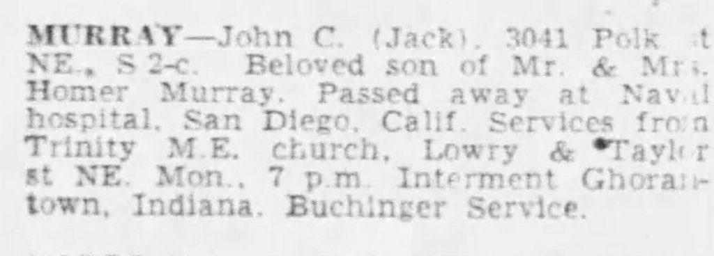 Jack’s path to the Navy is unknown at this time. He died at the Naval Hospital in San Diego, CA. Circumstances of his death are unknown.
