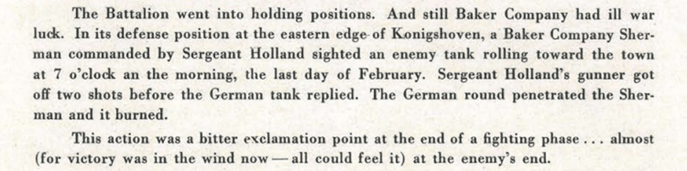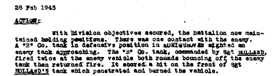 On 27Feb1945 Joe’s tank battalion was supporting infantry units in an attack on Konigshovin, Germany. By 0100 hours (1am) on 28Feb1945 the German’s had been cleared from the town. At 0700 hours (7am) Joe’s tank was in a defensive position when a German tank was spotted approaching the town. Joe’s tank fired twice at the German tank with both rounds bouncing off. The German tank fired back and scored a direct hit on the front of Joe’s tank. The shell penetrated the tank and caused it to burn. Joe and Private First Class Harold R. Heilman were killed.