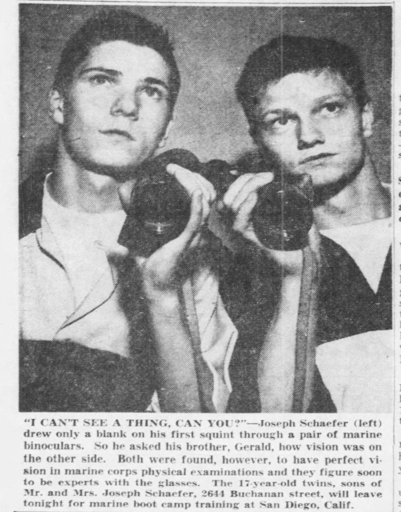 Joseph enlisted in the Marine Corps at 17 years old with his twin brother Gerald. They left for boot camp in San Diego, California on 15July1950.