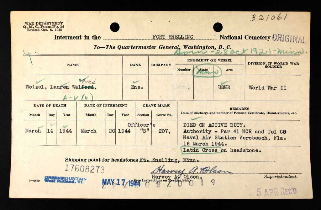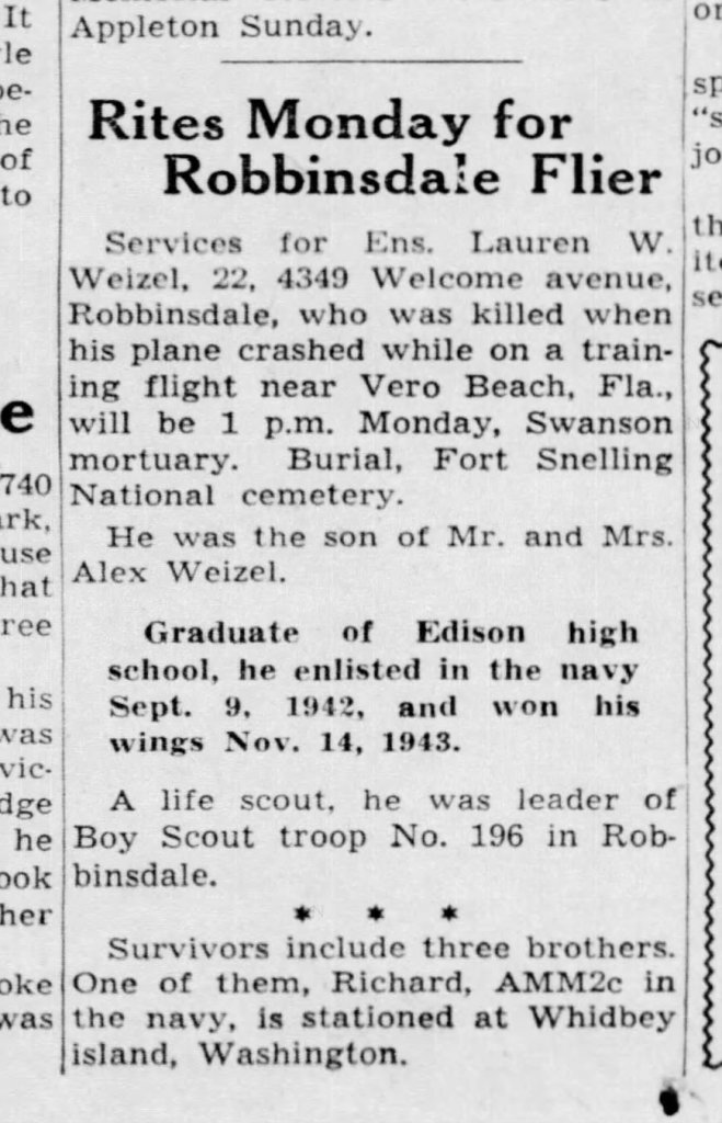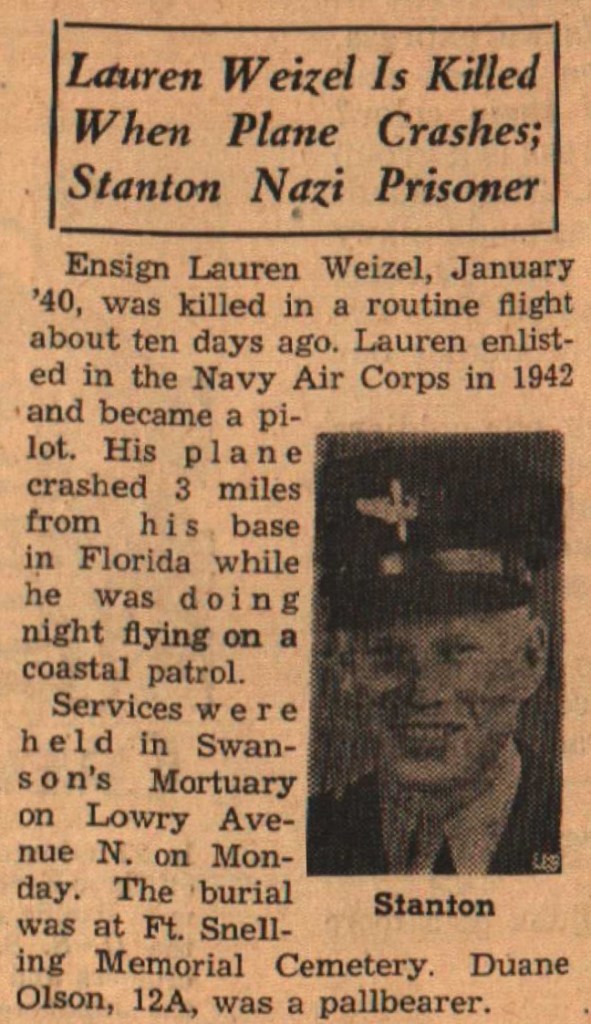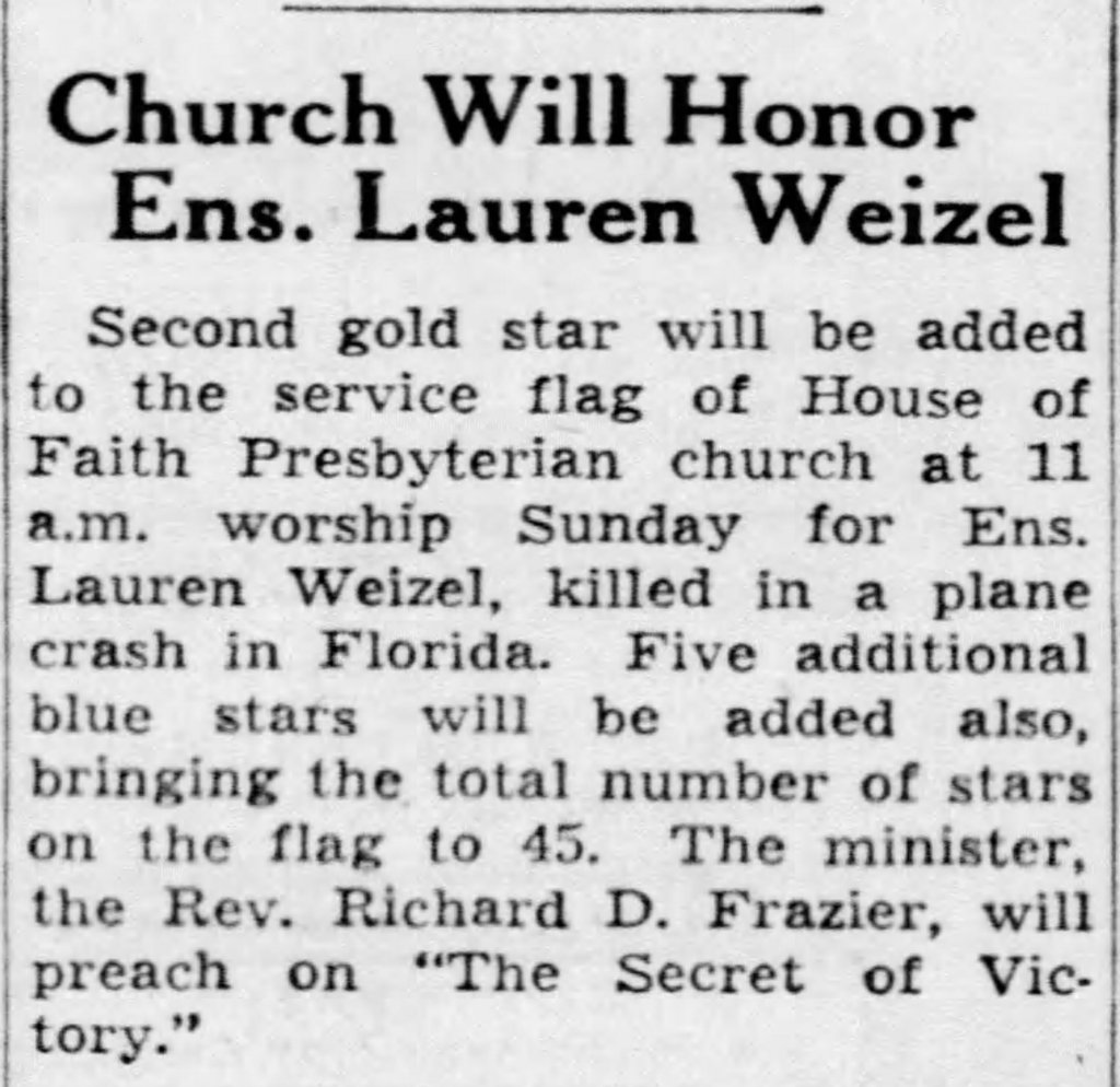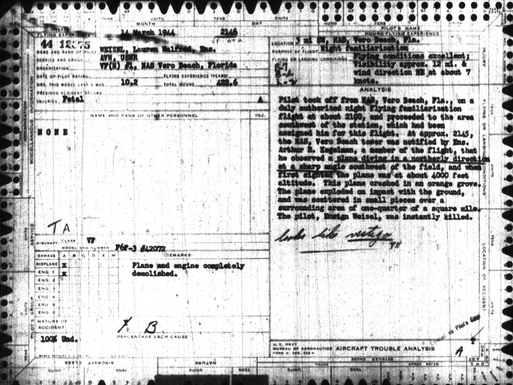 Lauren was killed in a plane crash while piloting a Grumman F6F-3 fighter plane on a routine night familiarization flight near Vero Beach, FL.