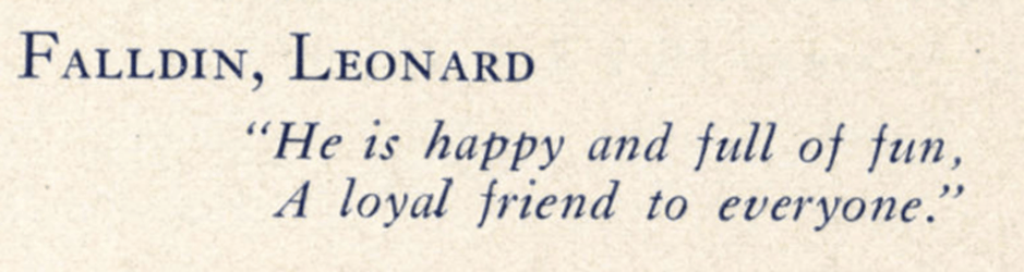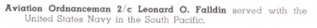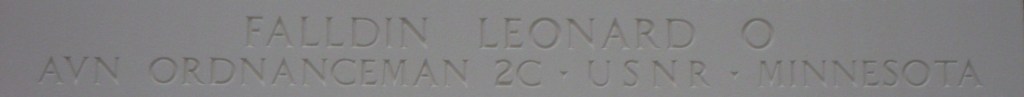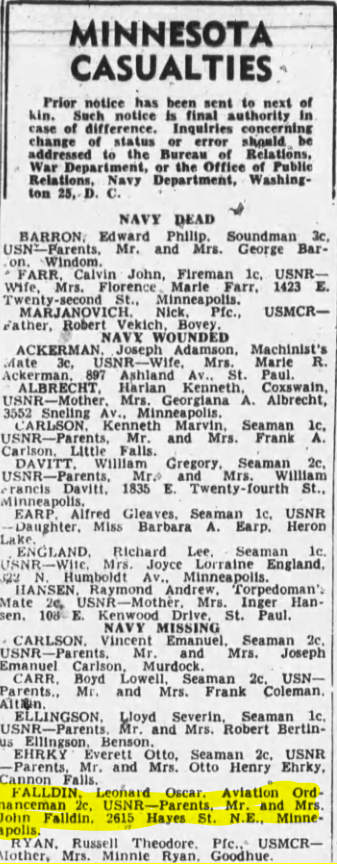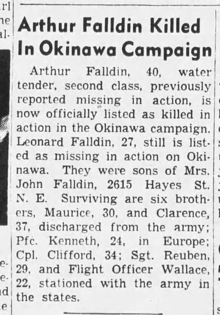 Leonard was not the only Falldin to serve in uniform during the war, nor was he the only Falldin to die in service. His older brother Arthur was killed 17Sep1945 when his ship struck a mine off the coast of Okinawa, Japan. His death came over a month after Japan had surrendered ending the war. Arthur did not attend Edison High School.