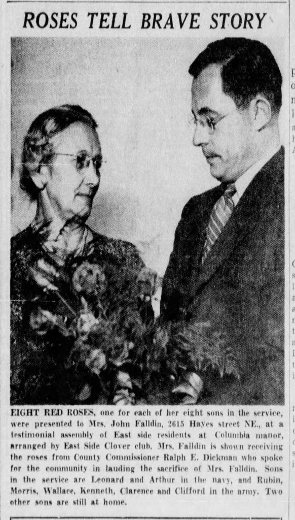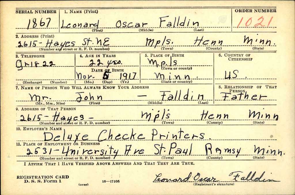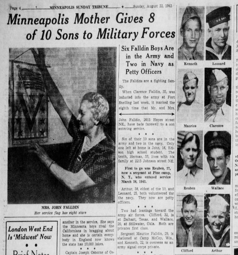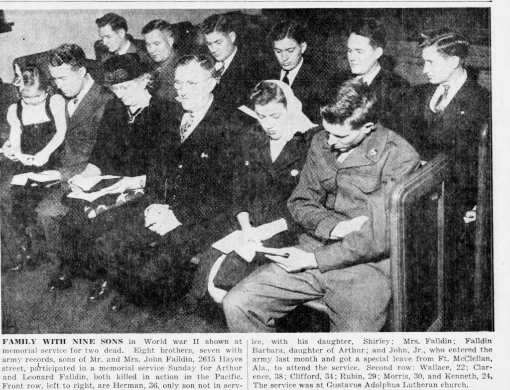 Leonard and Arthur were 2 of 10 Falldin sons. 8 of whom served during the war and the ninth was in the Army when the war ended. The 10th son was exempt from military service because his job was considered critical to the war effort. It is reported that he wanted to join as well. It was thought that 8 sons in service was the most of any family in the country.