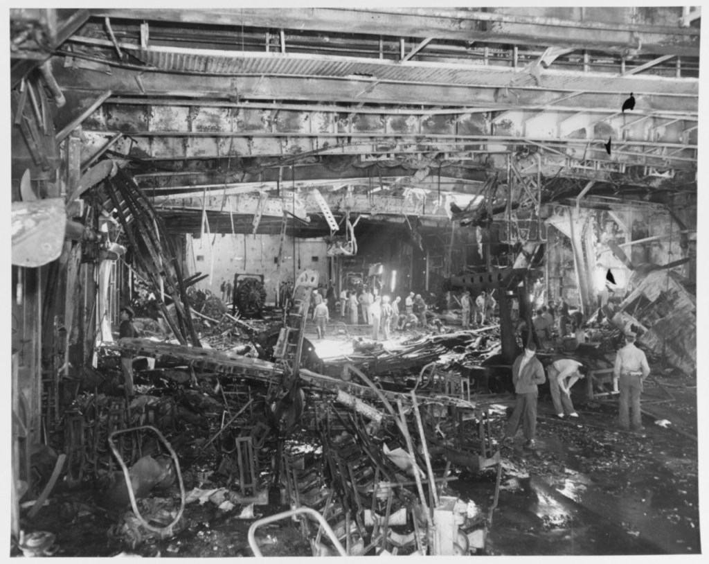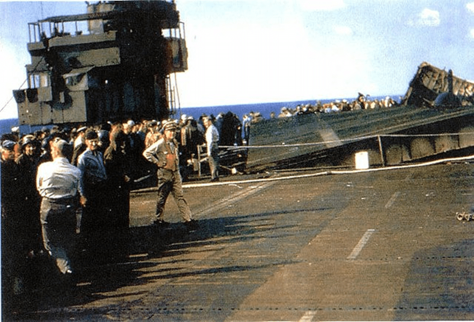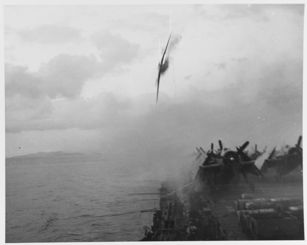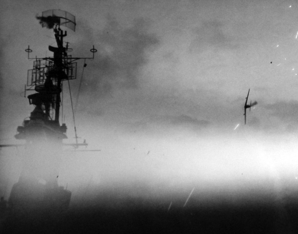 At 1925, another aircraft made it through her Combat Air Patrol and managed to avoid Anti-Aircraft fire from the ships. At 1933, the aircraft dropped a bomb that crashed dead center on her flight deck, followed by the plane itself also crashing into the ship. The bomb and parts of the plane penetrated the deck and exploded below. Initial damage was extensive, fires broke out on the flight deck, the hangar deck, and in the fuel deck, communications from the bridge were lost within 15 minutes, and the ship was soon out of control.