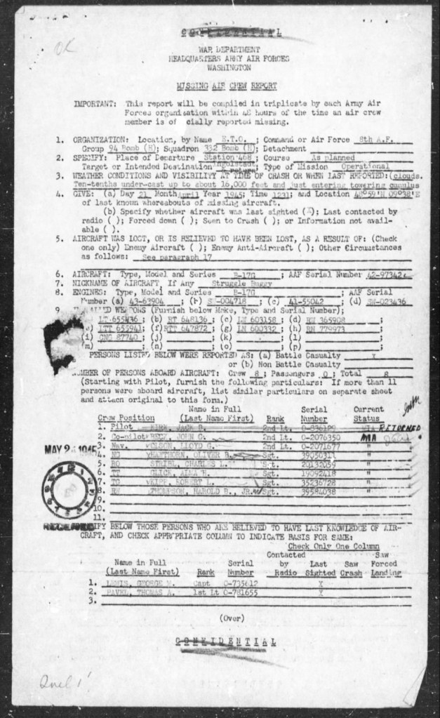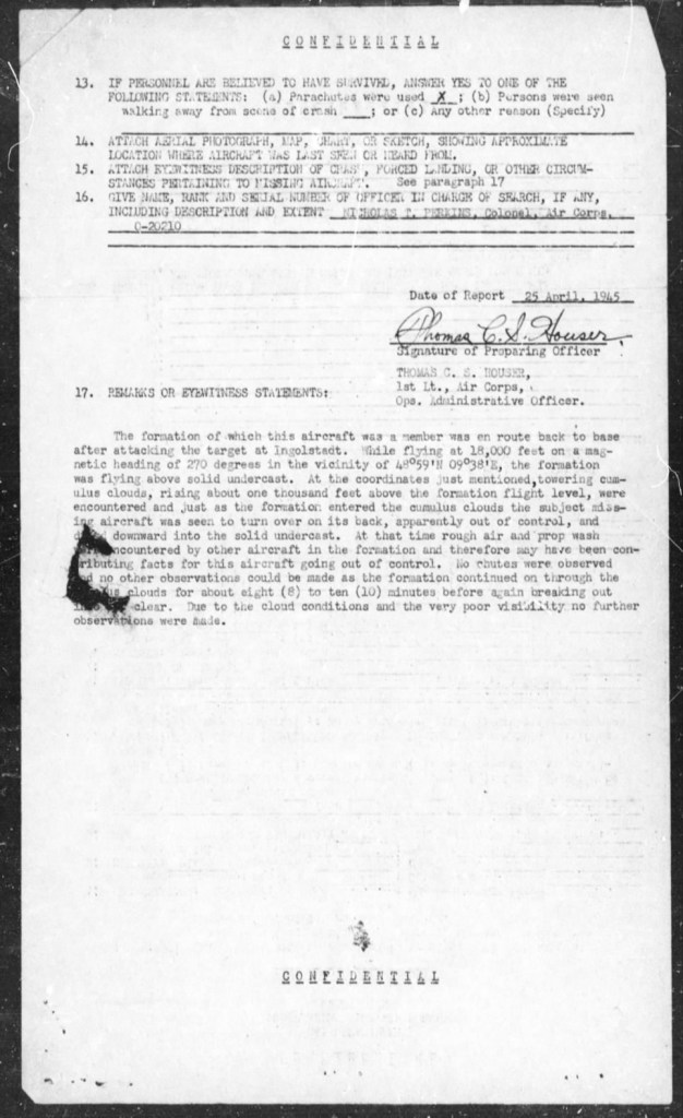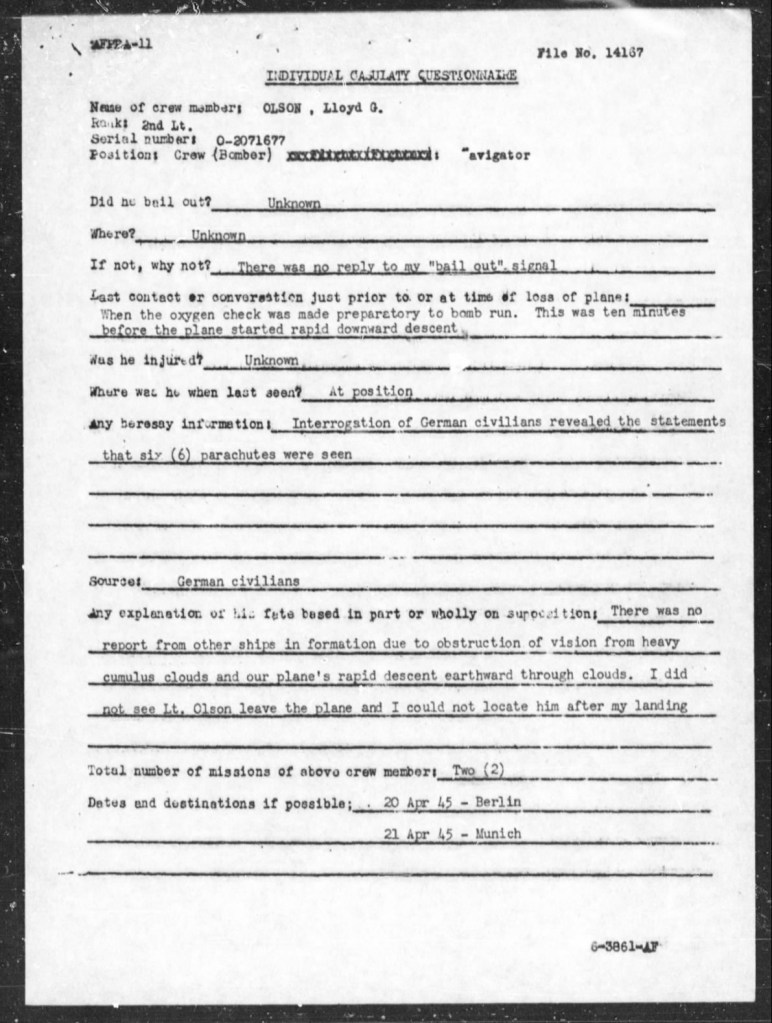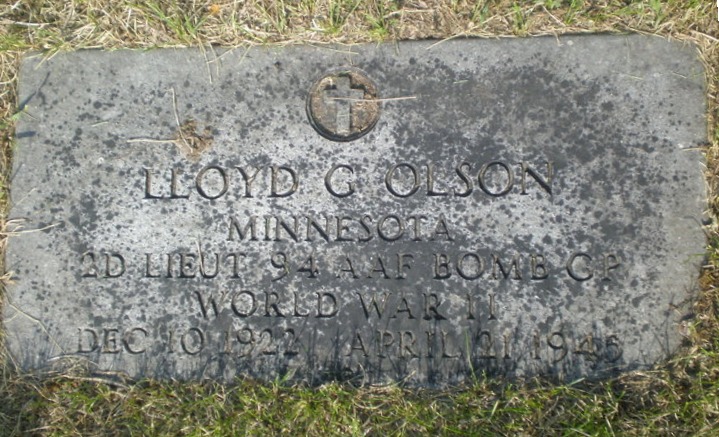 Lloyd’s last mission was a bombing run to Ingolstadt, Germany. After successfully attacking the target, the formation was returning to base. As the formation entered a large formation of cumulous clouds, the Struggle Buggy was observed to go out of control and flip upside down. Other planes in the formation noticed rough air and prop wash at this time. The pilot and co-pilot struggled to regain control of the plane but their efforts proved to be unsuccessful. The pilot ordered the crew to bail out of the stricken craft.