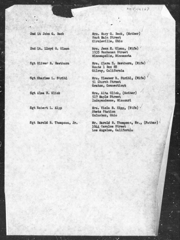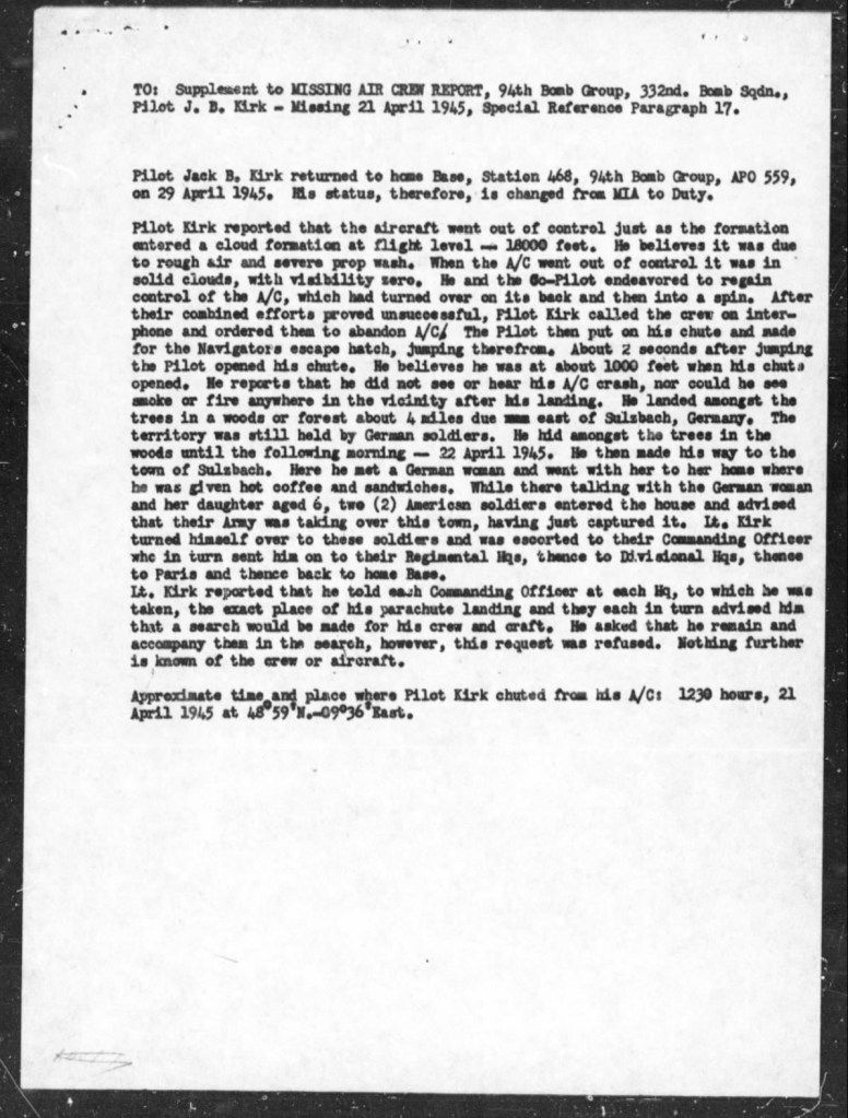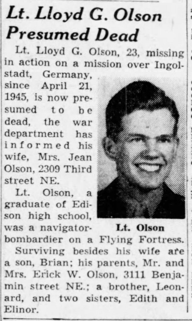 The pilot was the only crew member to successfully bail out of the plane. Lloyd and the other 6 men died when the plane crashed near Sulzbach, Germany.
