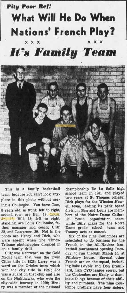 Louis graduated with the Class of January 1942. He participated in football and track while at Edison. He was also one of several Coulombe’s playing on the French team in the annual “All Nations” basketball tournament held in the Twin Cities.