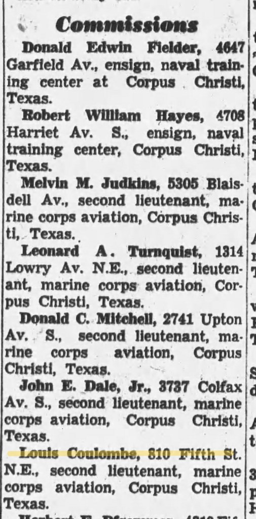 By the end of 1942 he was stationed at the Naval Reserve Aviation Base in Minneapolis, MN.