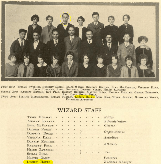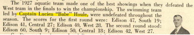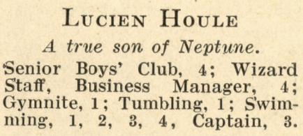 Lucien graduated with the Class of 1928. He was an accomplished swimmer who was a two-time letter winner and captain his junior season. He also participated in gymnastics. He was the business manager of the Wizard yearbook. Lucien won a Life-Saving contest as a Boy Scout his 9th grade year!