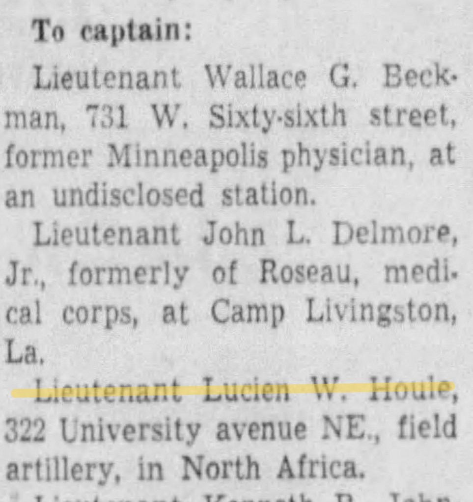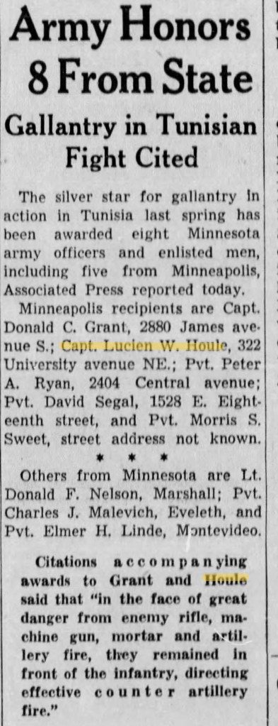 CAPT. LUCIEN W. HOULE, for gallantry in action in April and May, 1943, on Hill 609 in Tunisia. Capt. Houle was serving as Liaison Officer and was conducting effective artillery fire upon enemy troops, tanks, vehicles, and gun positions. During this time he was constantly under heavy enemy rifle, machine gun, mortar and artillery fire and numerous times was in positions in front of the infantry which his artillery was supporting. With enemy rifle, machine gun, mortar, and artillery shells falling on and around his position, and enemy aircraft bombing and strafing the position, Capt. Houle continued to remain in front of his infantry and conduct effective artillery fire upon the enemy. His conduct, leadership, and attention to duty in the face of grave danger were exemplary and a credit to the armed forces of the United States. Address, 322 University Ave., Northeast, Minneapolis, Minn.