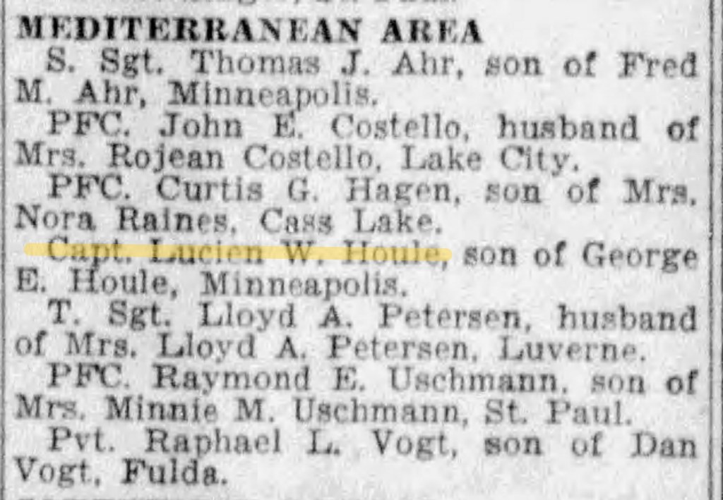 On 4Apr1944, Captain Lucien Houle was killed in action. The circumstances of his death are unknown.
