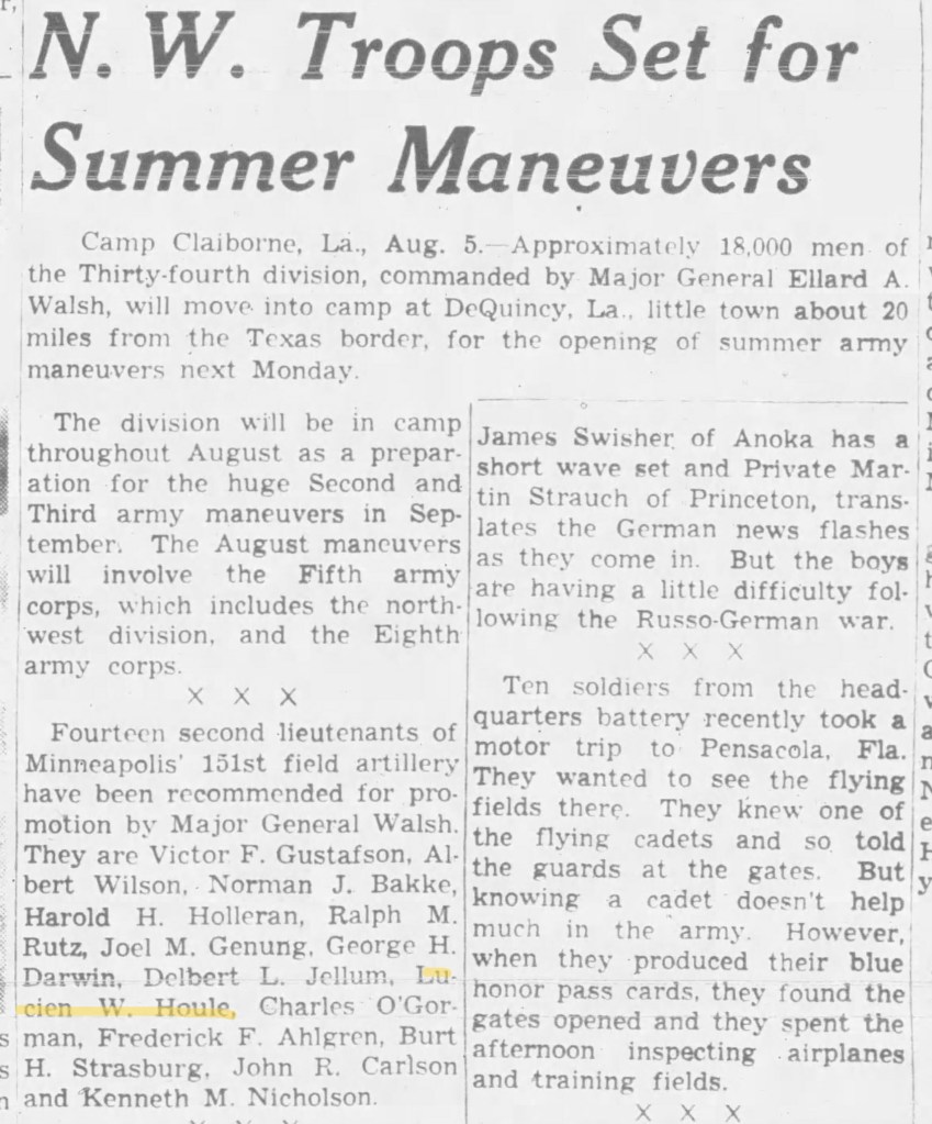 In August 1941, while at Camp Claiborne, 2nd Lieutenant Houle recommend for promotion to Lieutenant.