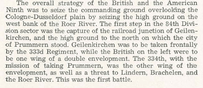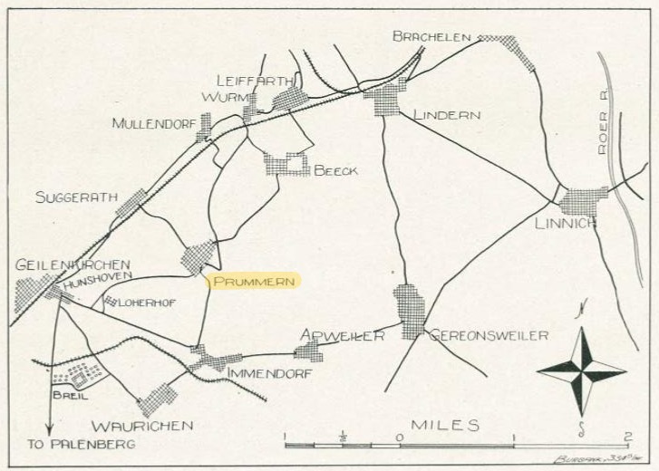 The Regiment pushed forward aggressively. The Second Battalion :forced itself onto the objective, the high ground southwest of Prummern, guaranteeing the 333d’s attack on Geilenkirchen. At 1510 this ground was secure. On the right, the First Battalion moved into Prummern frontally. B and C Companies were the first to enter the town. The sky was darkening, and our air cover was less useful.