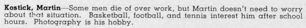 Martin graduated with the Class of June 1939. He was an excellent student, and he was involved in 4 intramural sports. Martin’s sister recalled that their mother would scold Martin for still being awake and studying at 4 a.m.!