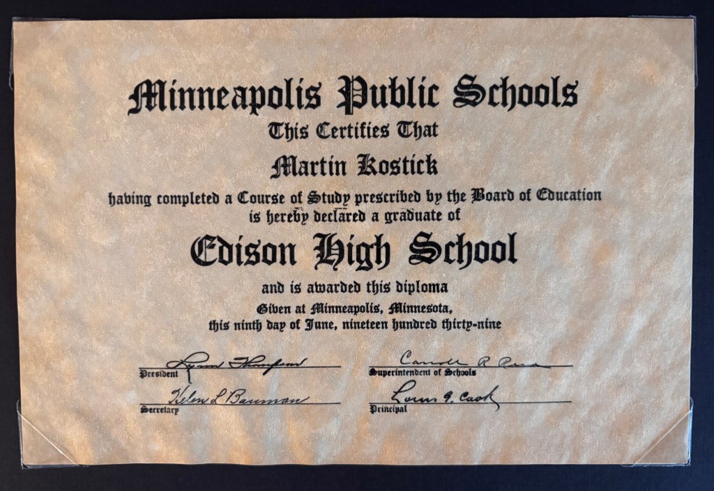 After graduation Martin attended the University of Minnesota. He was close to graduating when he was drafted into the Army. He had intended to enter Law School.
