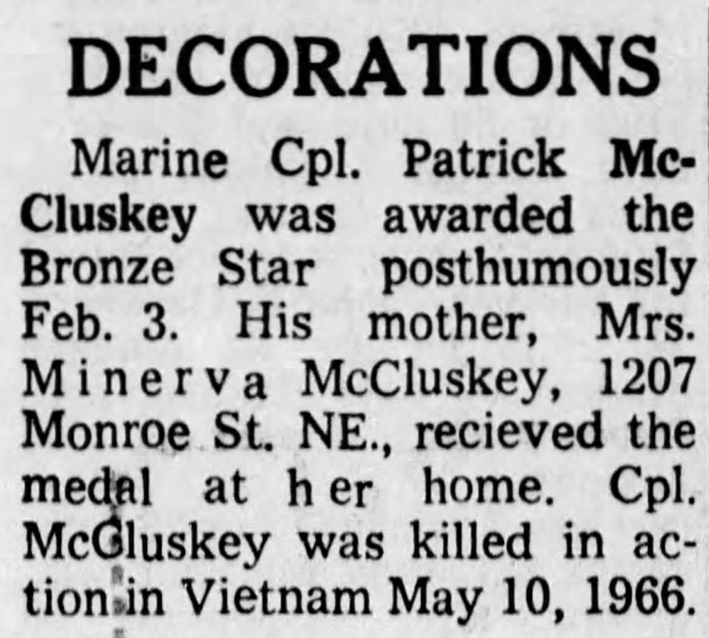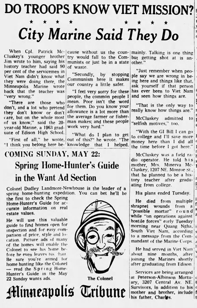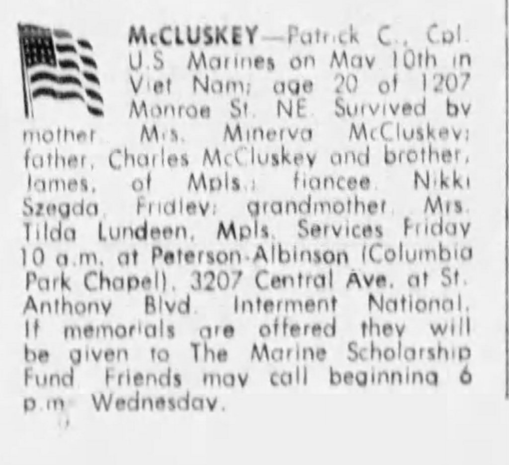 Patrick was killed in the firefight by an enemy rifle grenade. The day after Patrick was killed, the Star Tribune wrote an article about a correspondence between Patrick and his younger brother Jim.