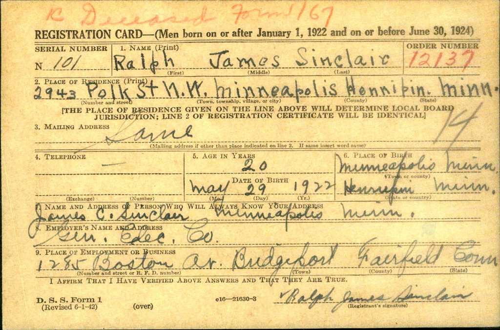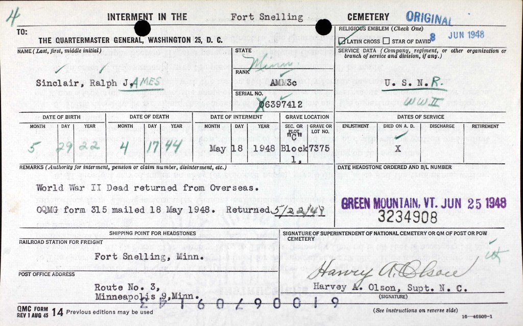 In May 1948 Ralph’s remains were returned to Minnesota. He is buried at Fort Snelling National Cemetery in Minneapolis, MN.