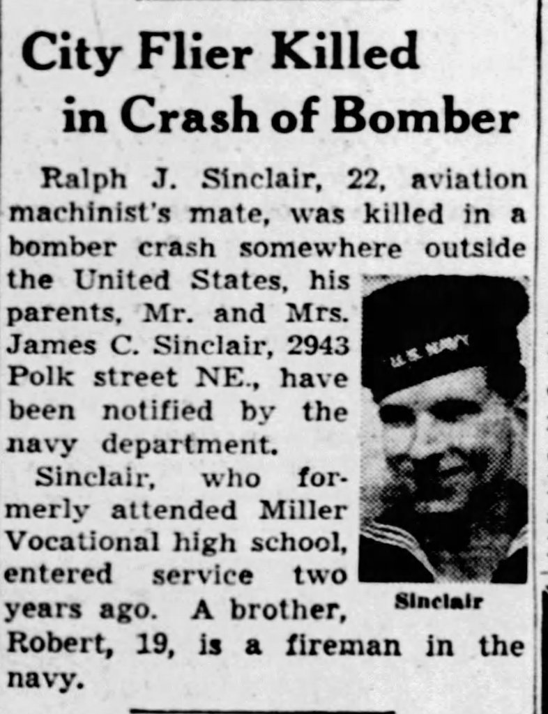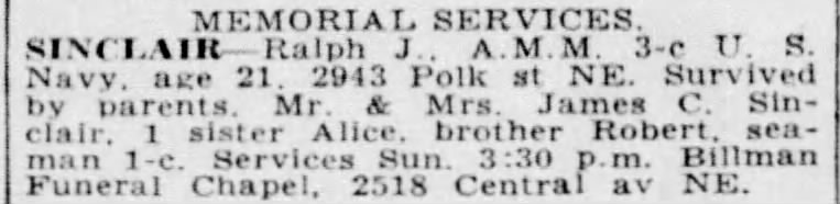 Ralph was buried in a temporary cemetery in Trinidad. On 19May1944 a memorial service was held at Billman Funeral Chapel in NE Minneapolis.