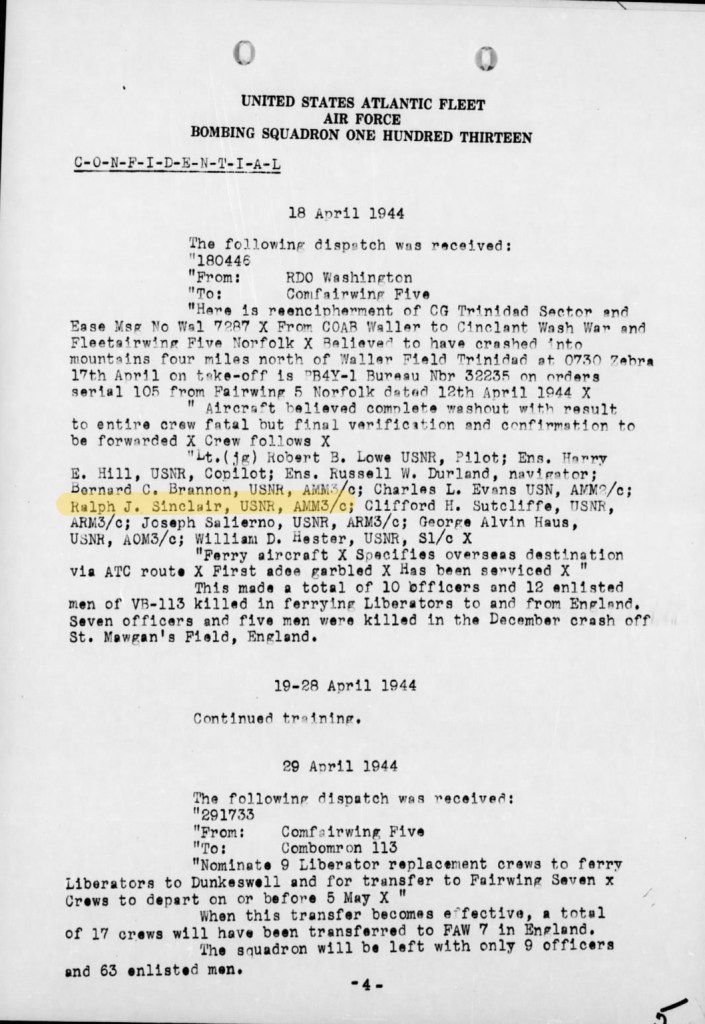 On 11Apr1944, the squadron was ordered to transfer 14 more replacement crews to FAW-7 at Dunkeswell, England. Ralph was a crew member on one of these planes.